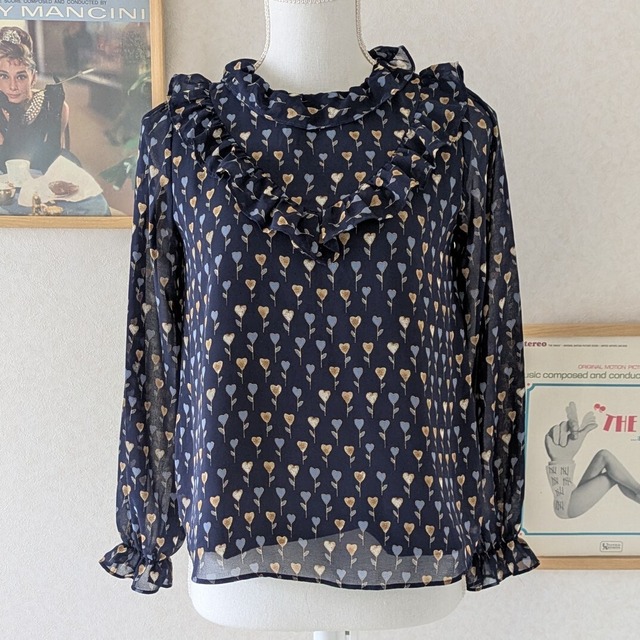 レトロ ハート花柄フリルブラウス ネイビー サイズS程度 used レディース古着