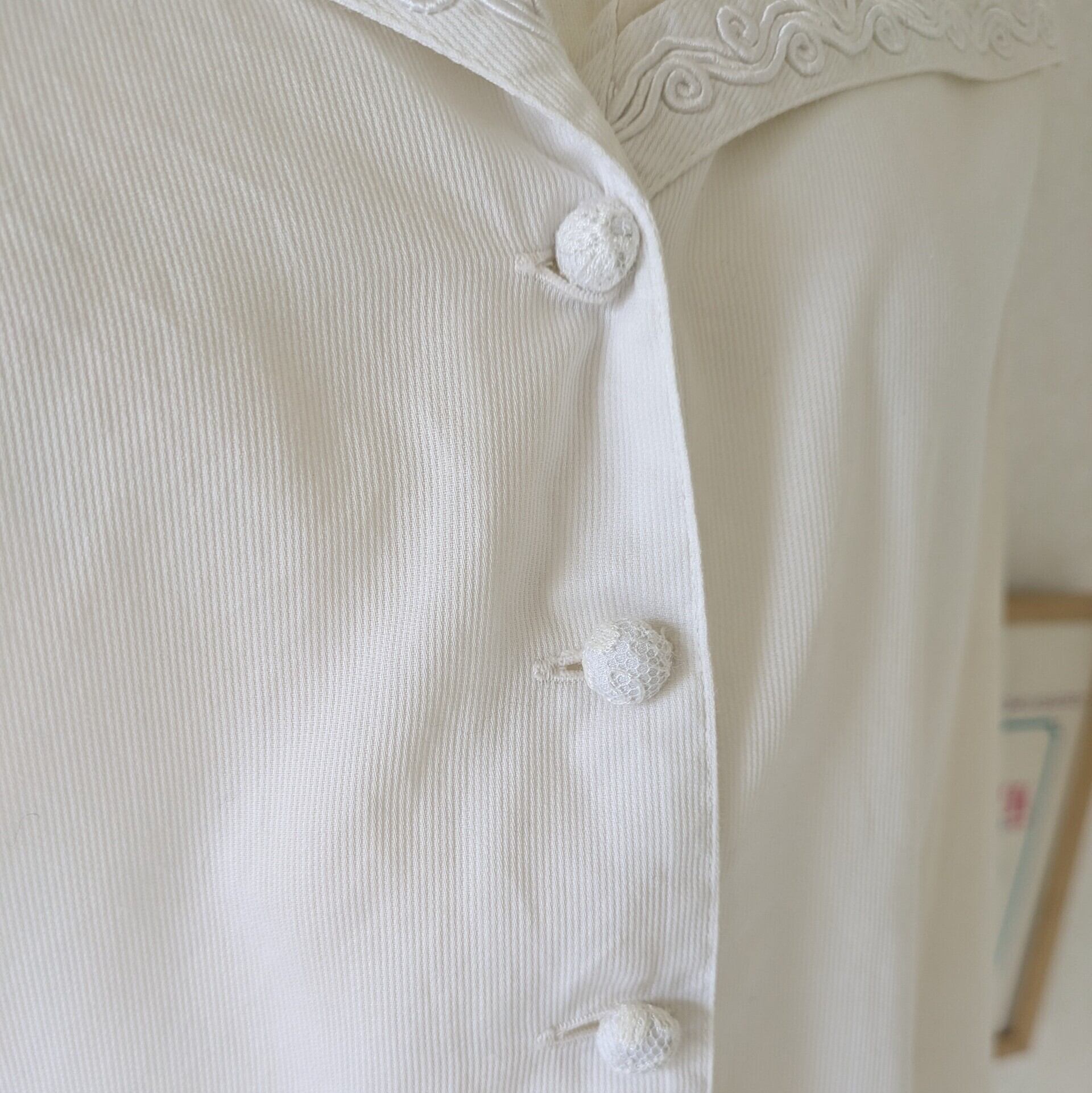 透け感のあるベージュのオーガンジーの大きな襟が特徴的。