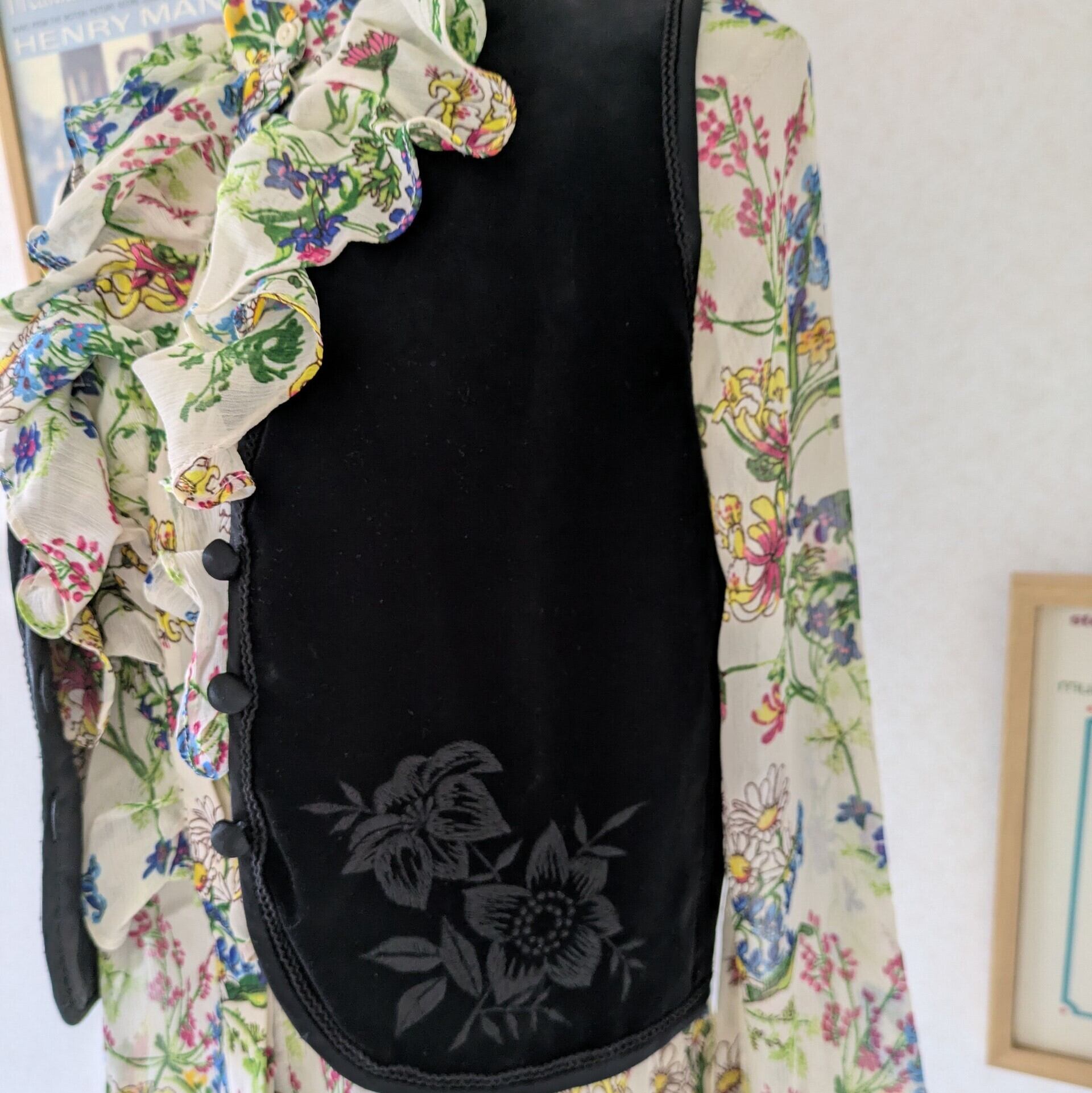 フロントに入ったお花の刺繍やサテンのボタンがちょっとチャイナっぽいテイストも感じられます。