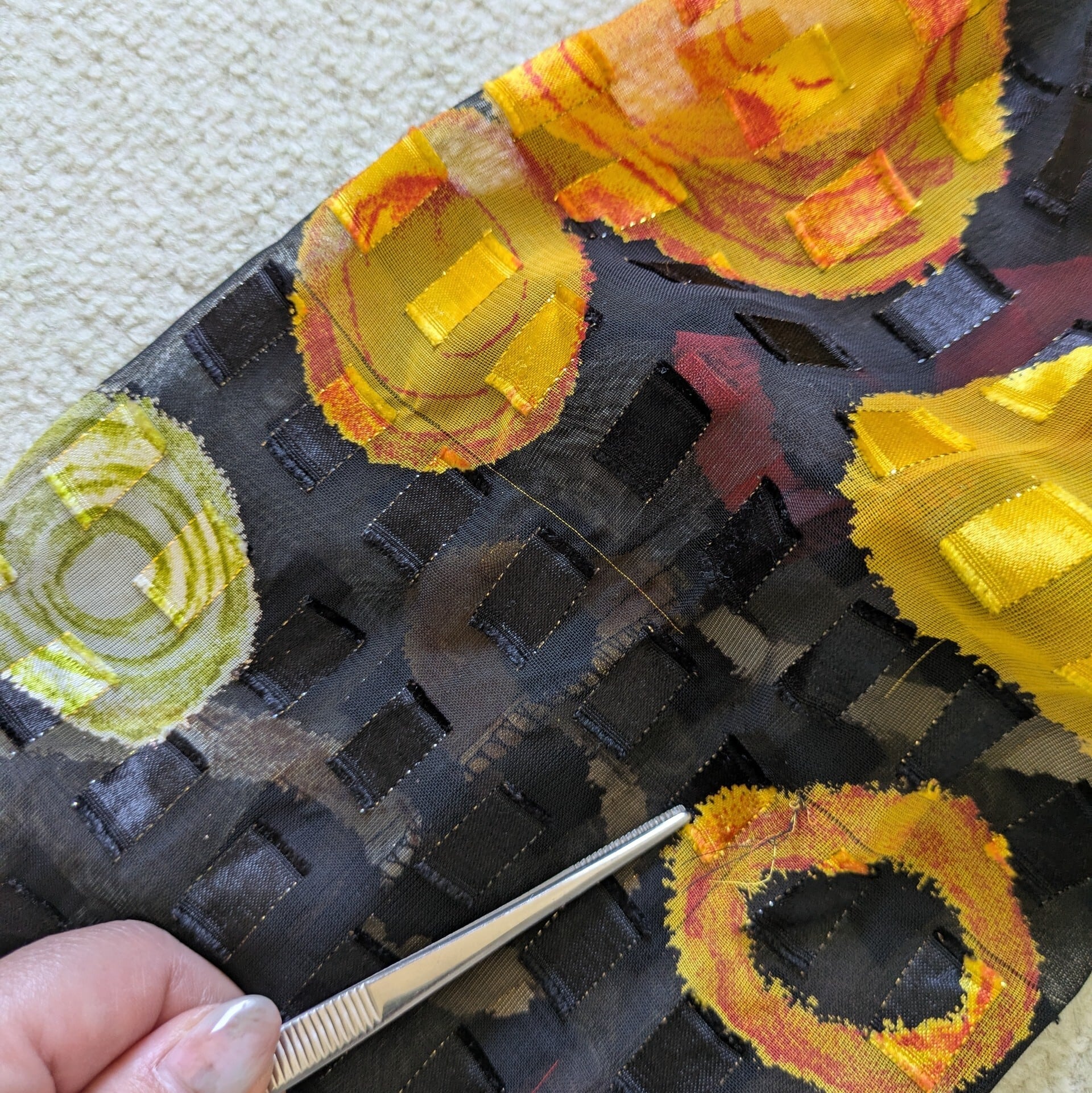 カラフルな丸がたくさん描かれたシアーブラウスです。