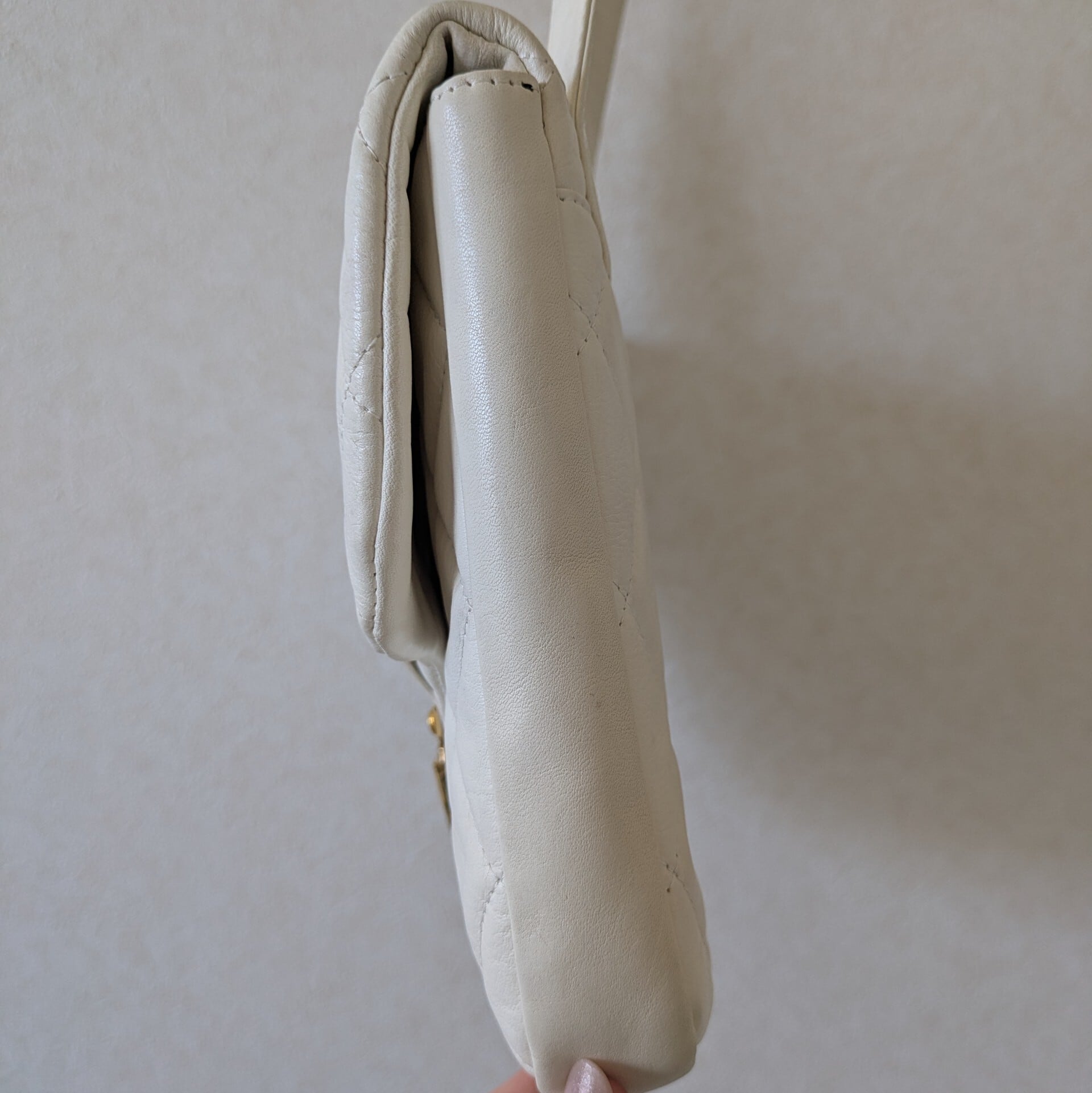 薄めのマチと後ろ側に付いたショルダーで収まりよく肩掛け出来ます。