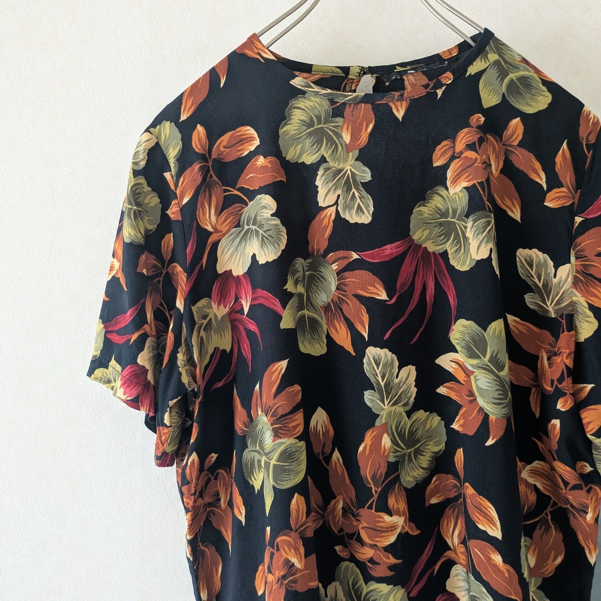 ブラックにシックなブラウン系の花柄がレトロな雰囲気で、カーディガンなどをプラスすれば秋まで使えるアイテムです!