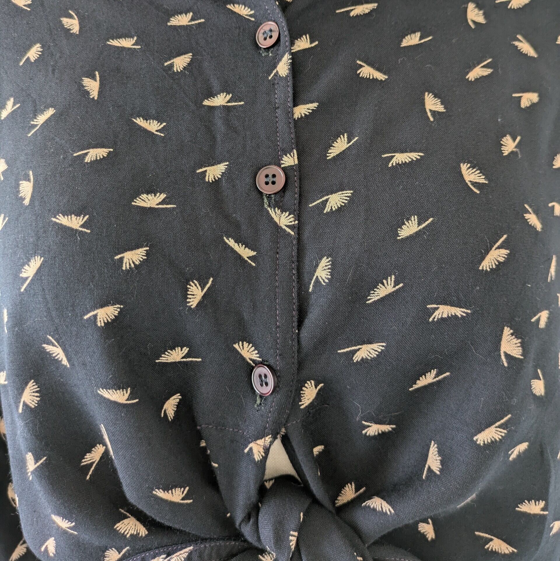 黒いレーヨンの地に羽根のような柄がレトロな雰囲気。