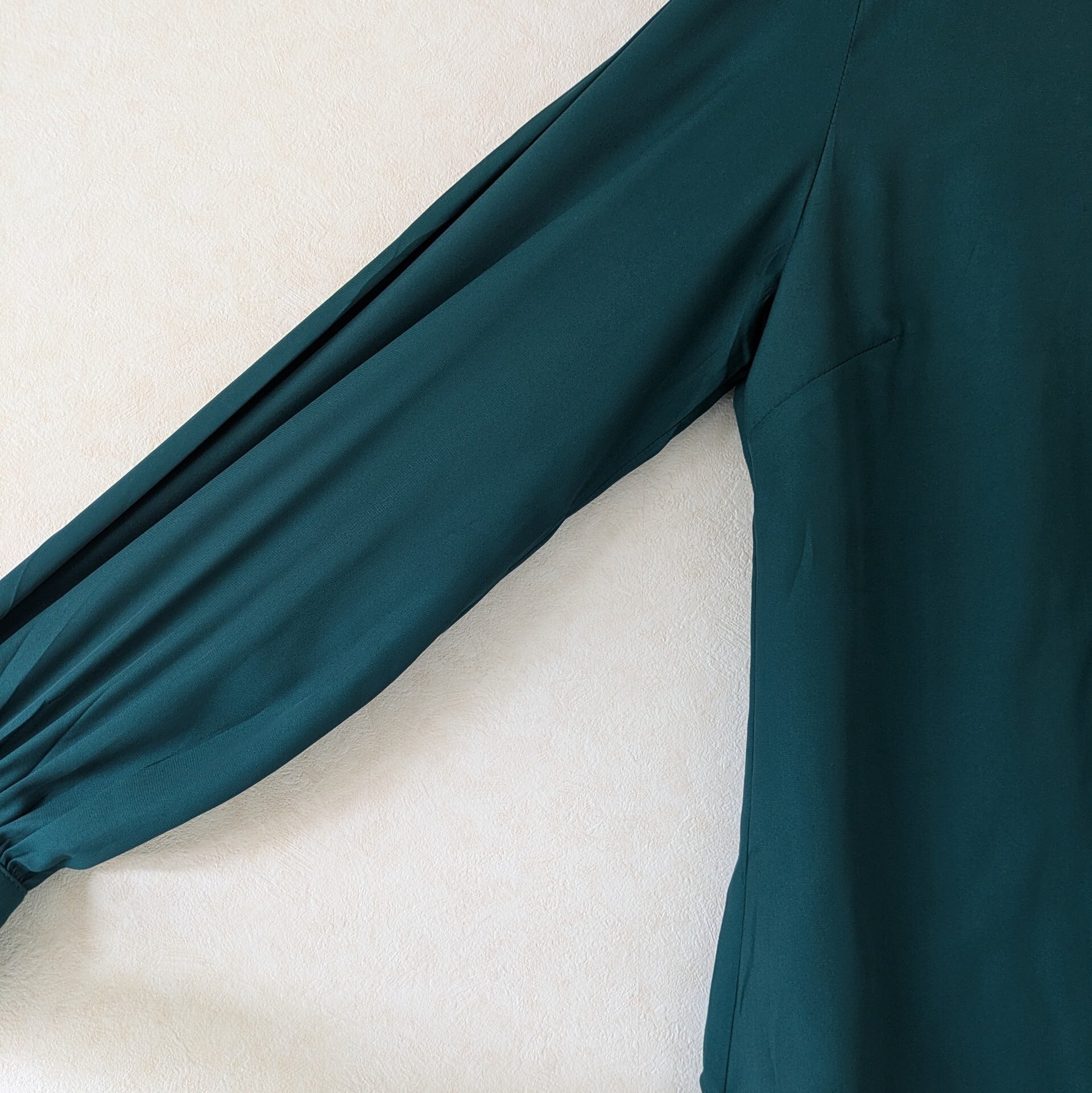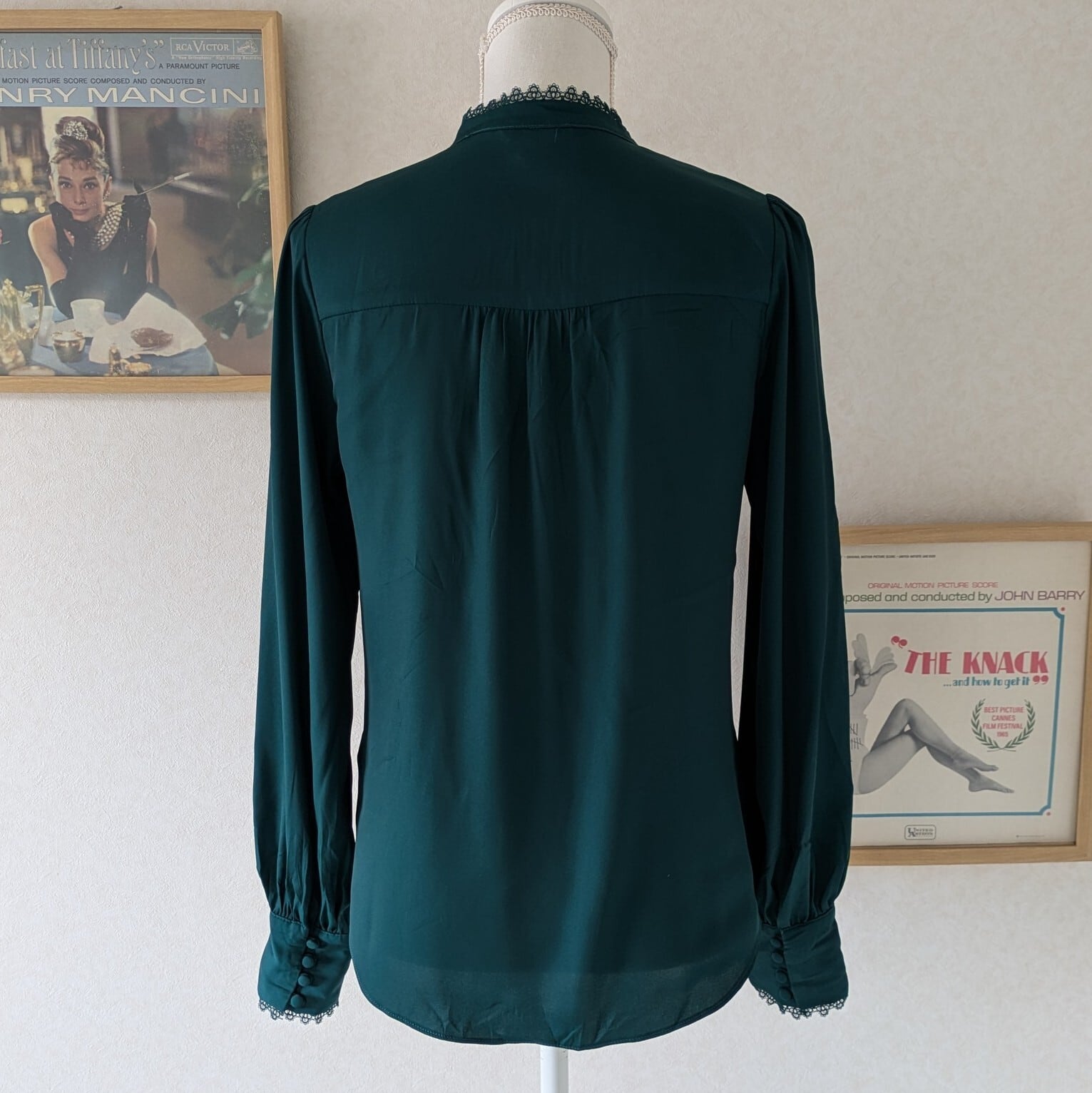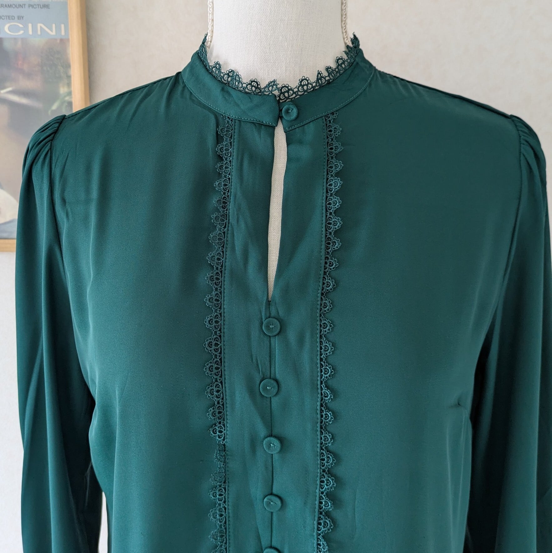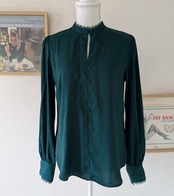 くすみカラーの濃いグリーンが素敵なブラウスです。