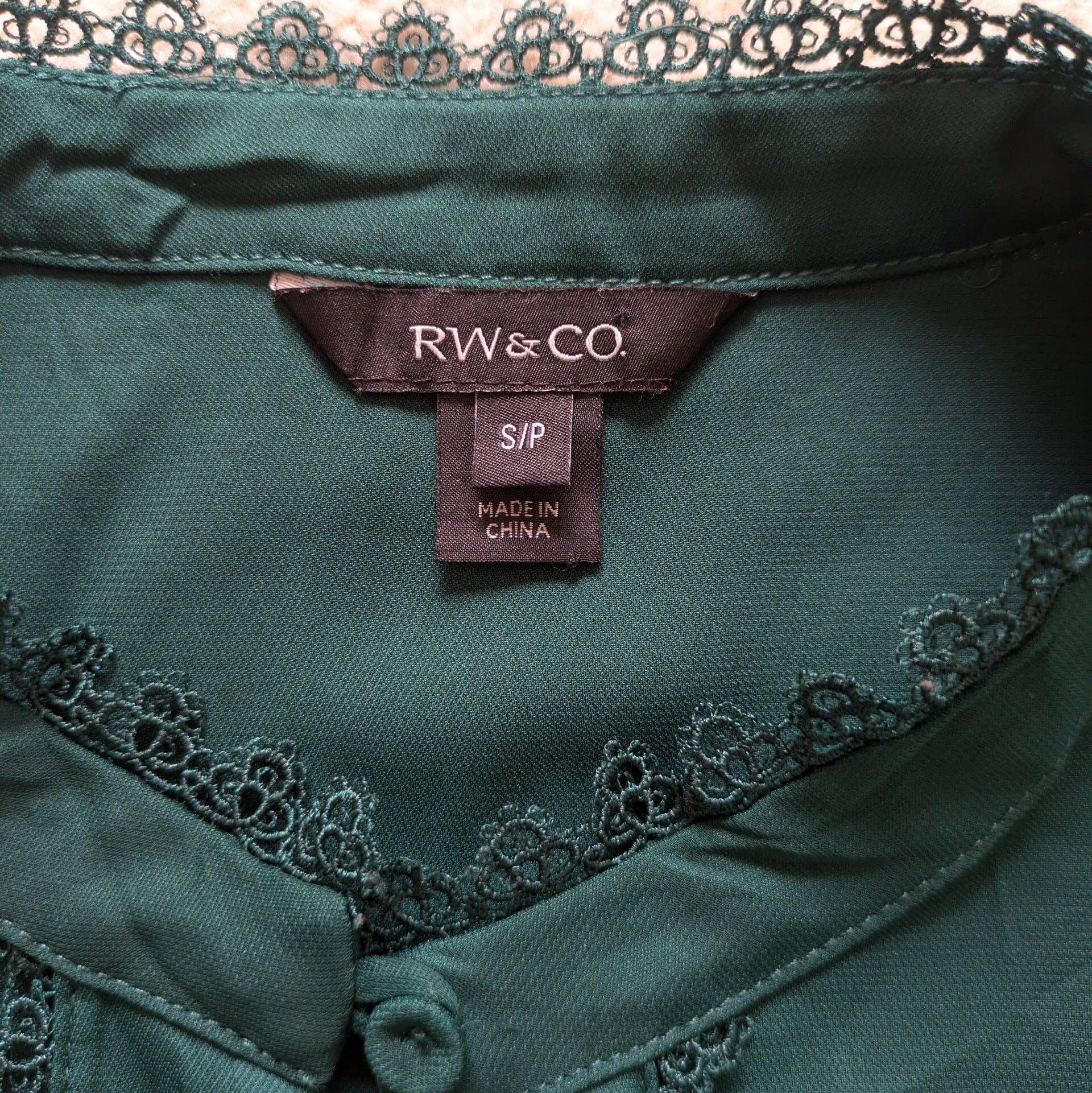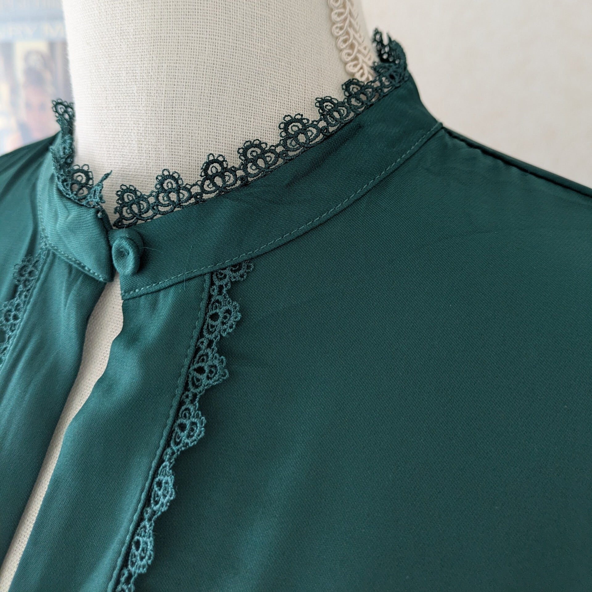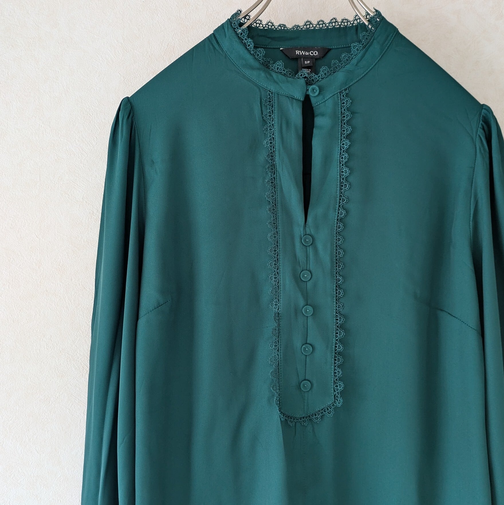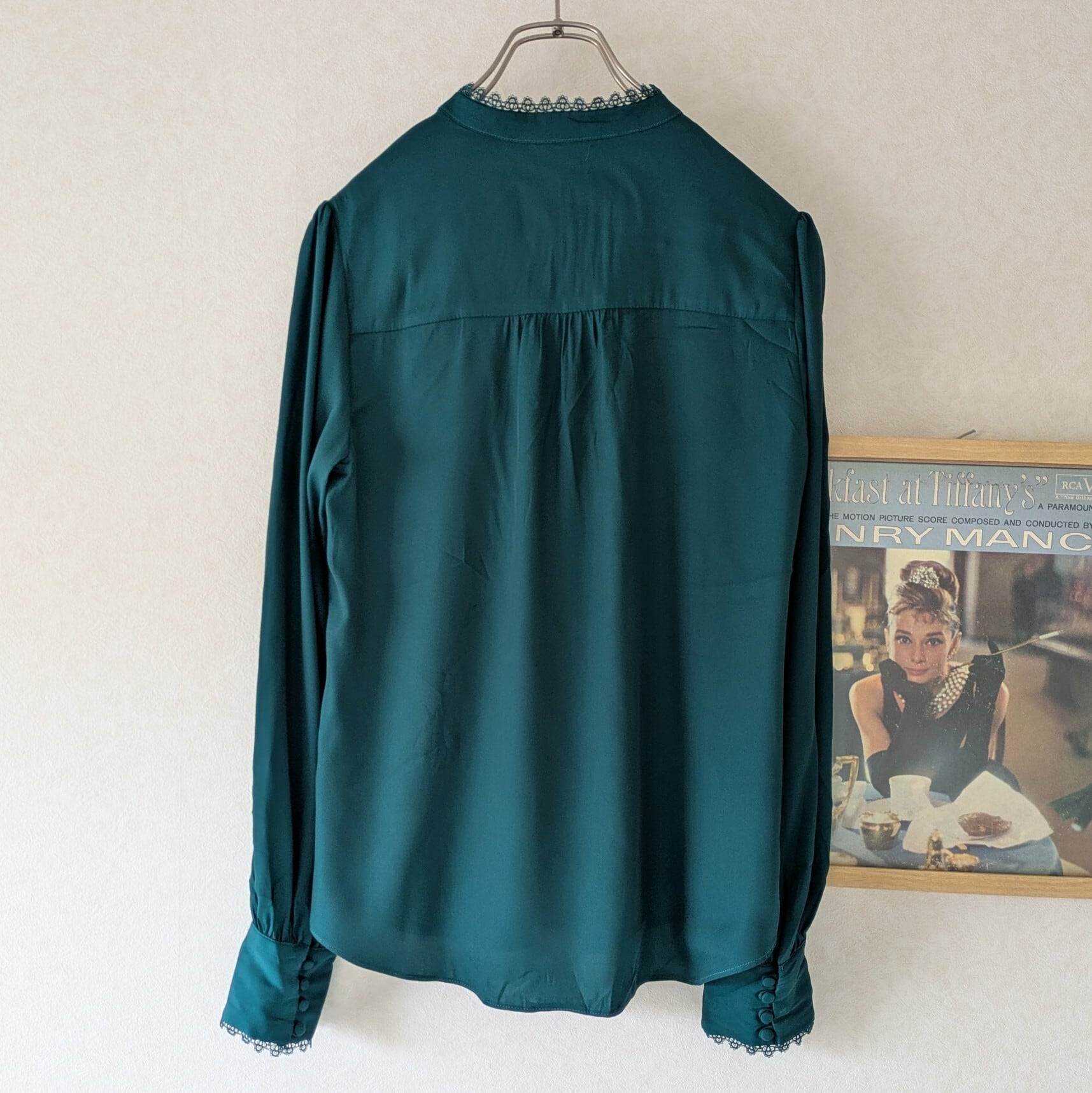 くすみカラーの濃いグリーンが素敵なブラウスです。