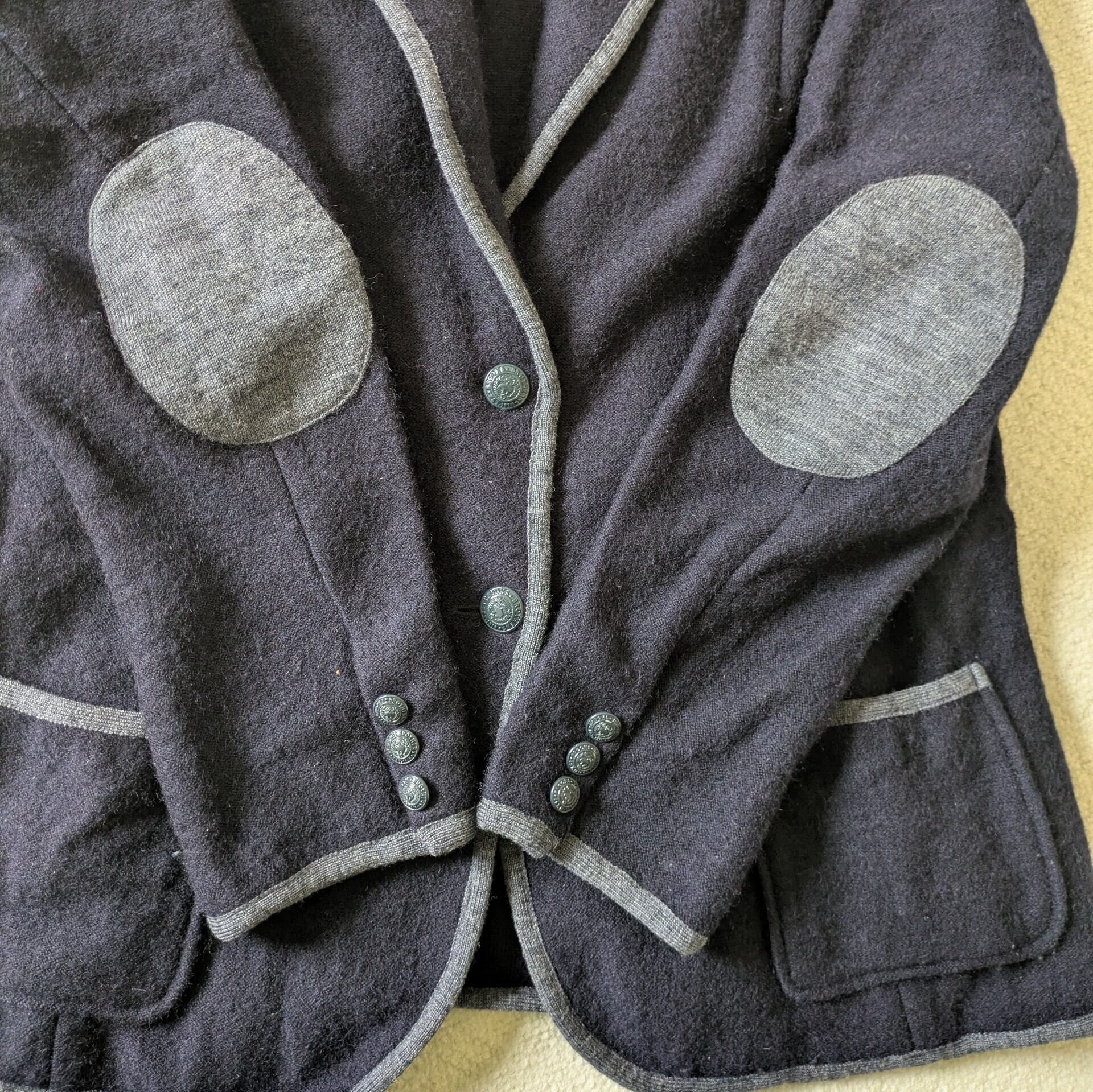 グレーのパイピングとエルボーパッチがトラディショナルな雰囲気。