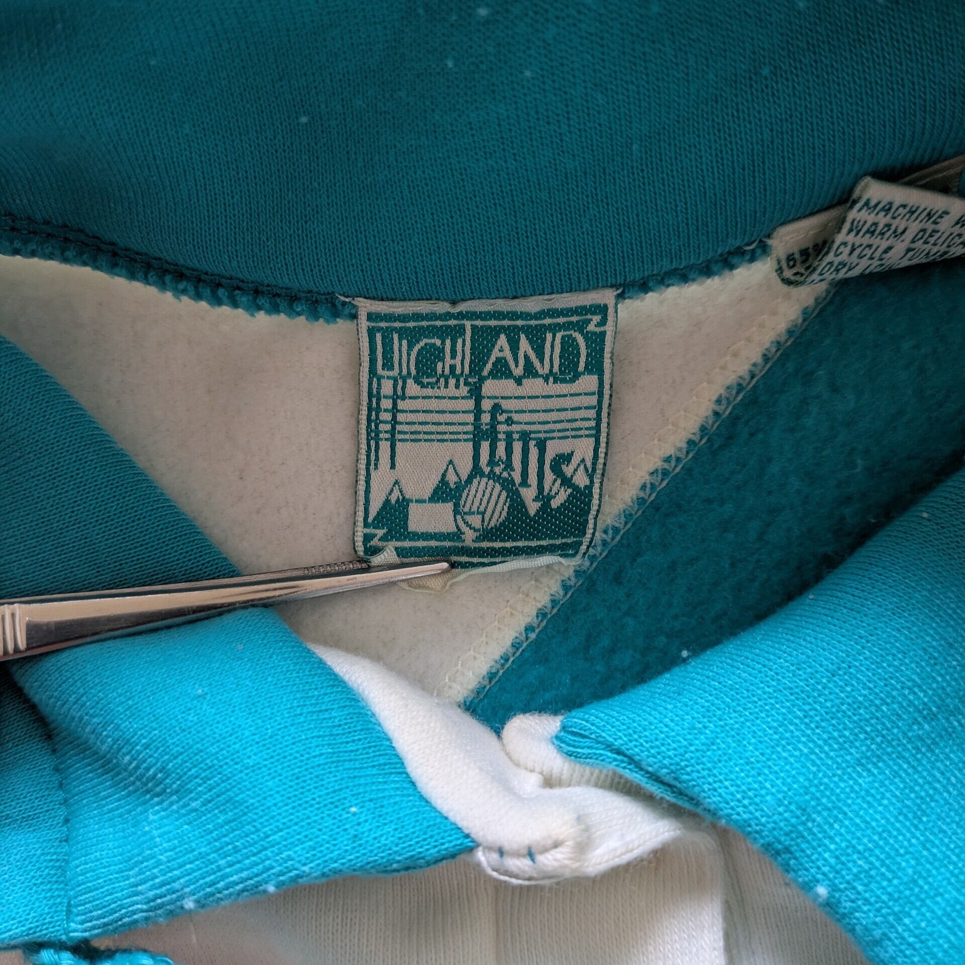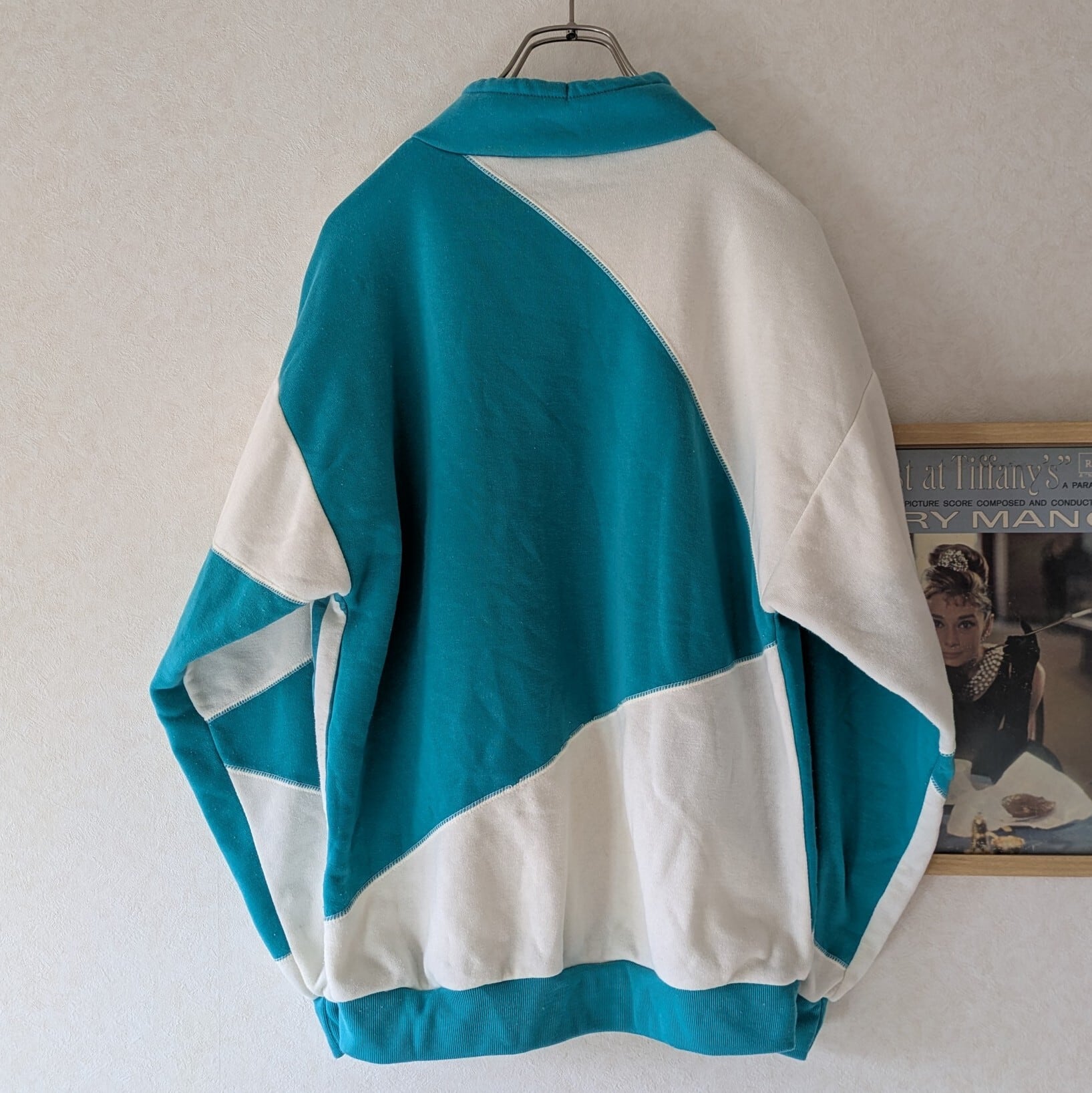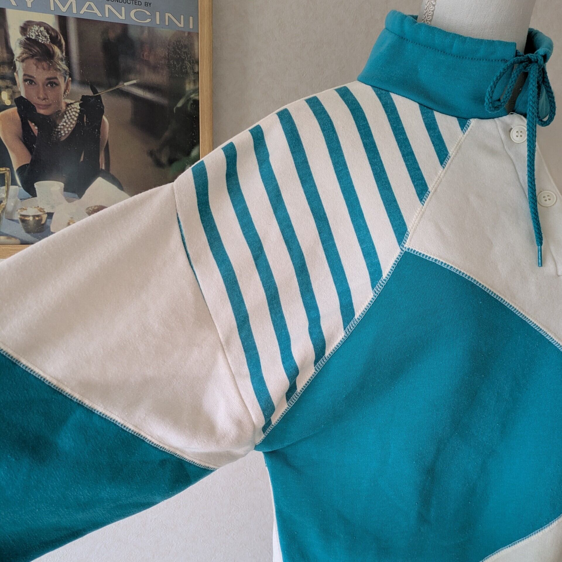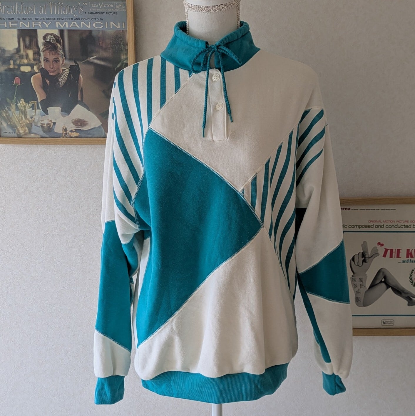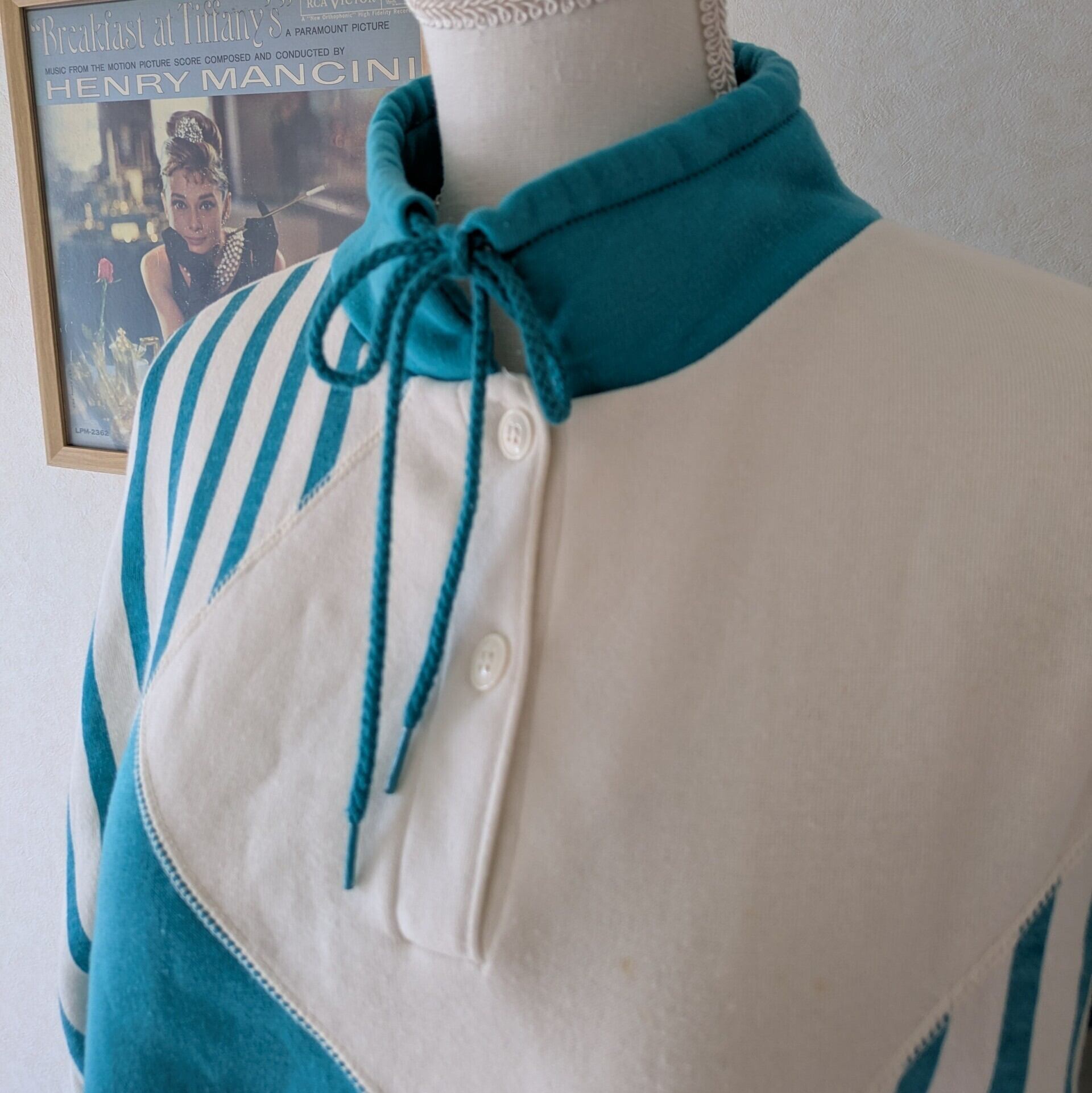 エメラルドグリーンのボーダーがマルチに配置されたレトロなプルオーバーです。