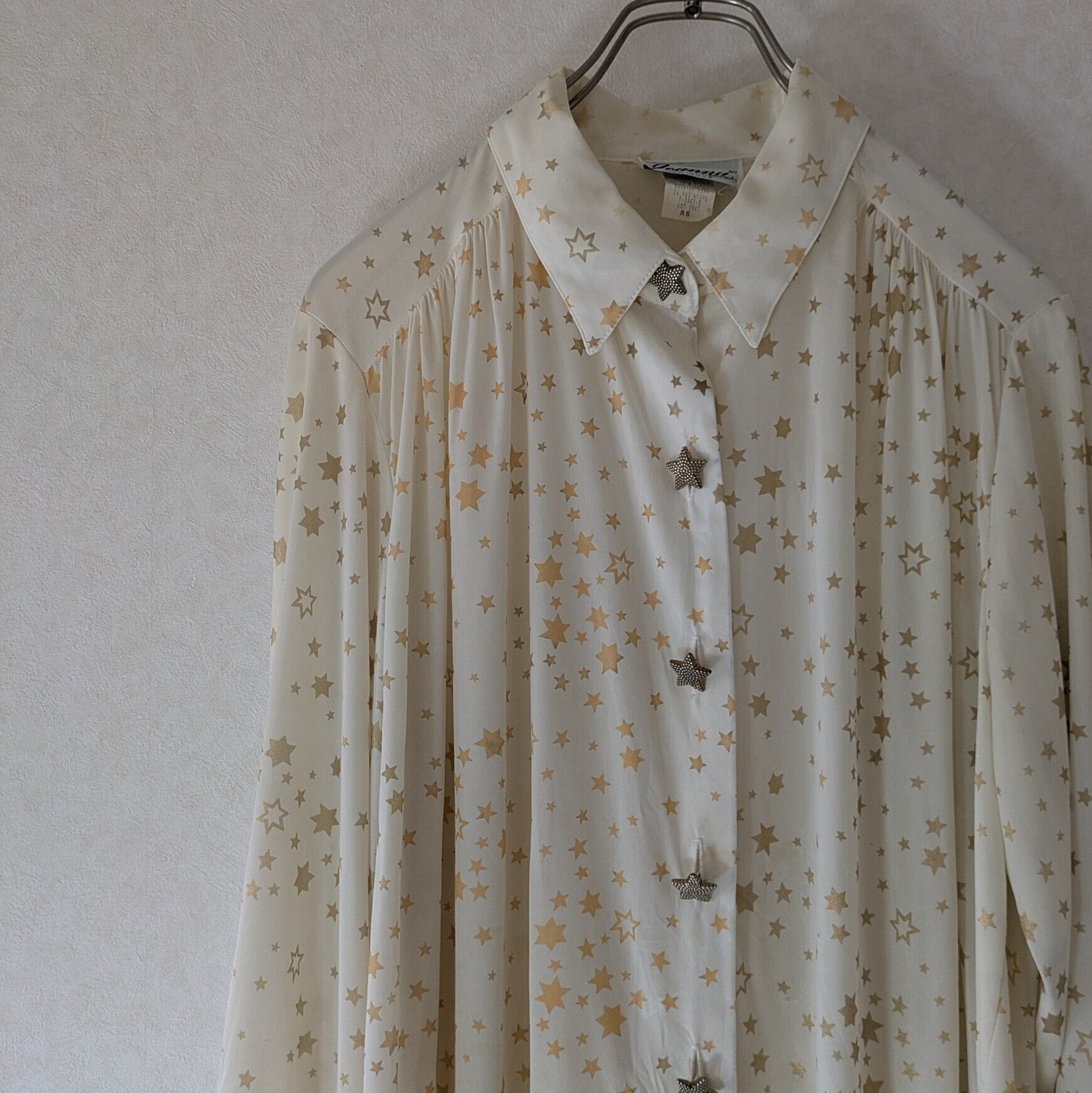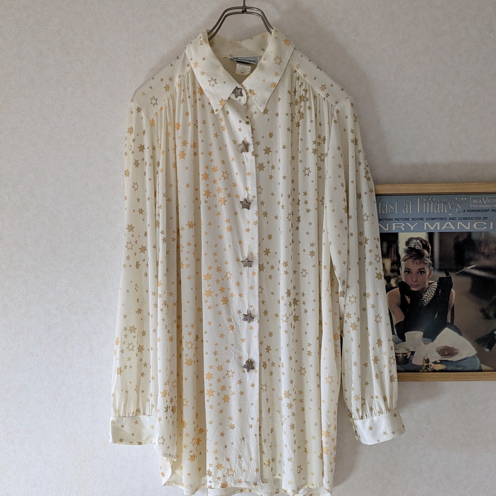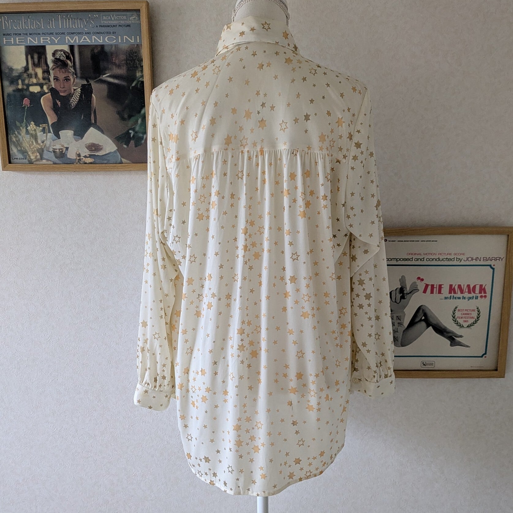 オフホワイトにゴールドの星柄プリントと大きな星のボタンが個性的なブラウスです。