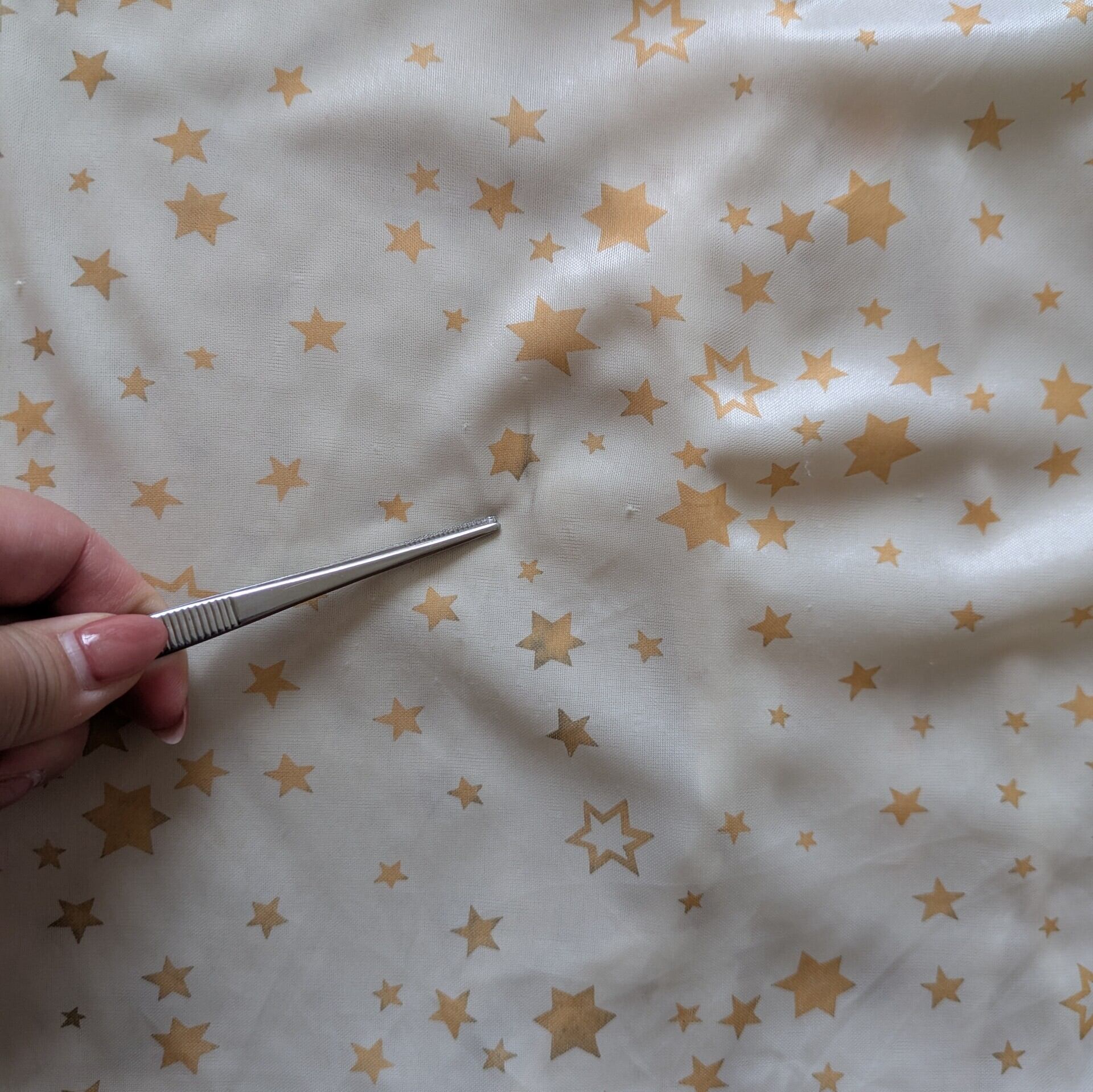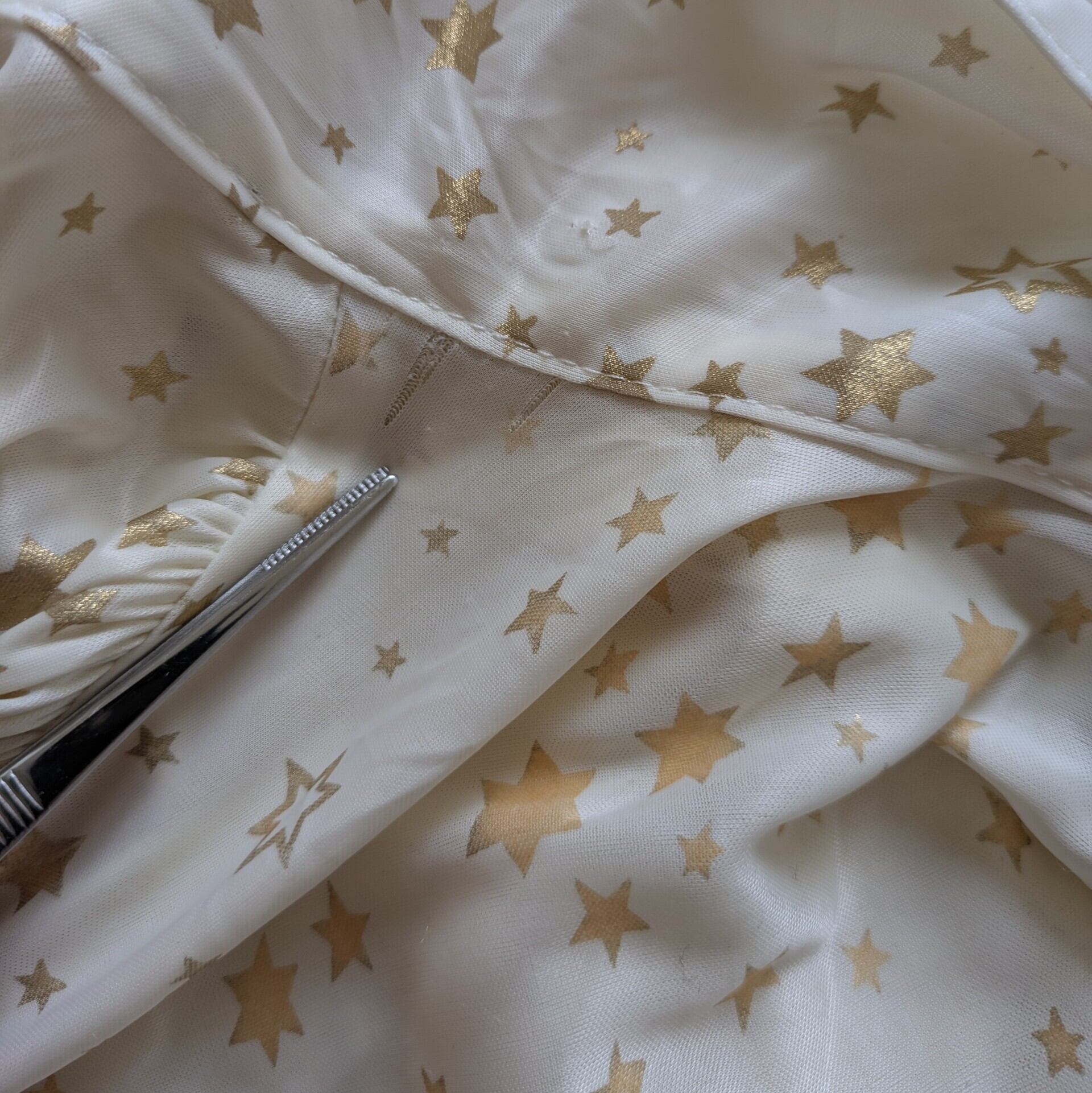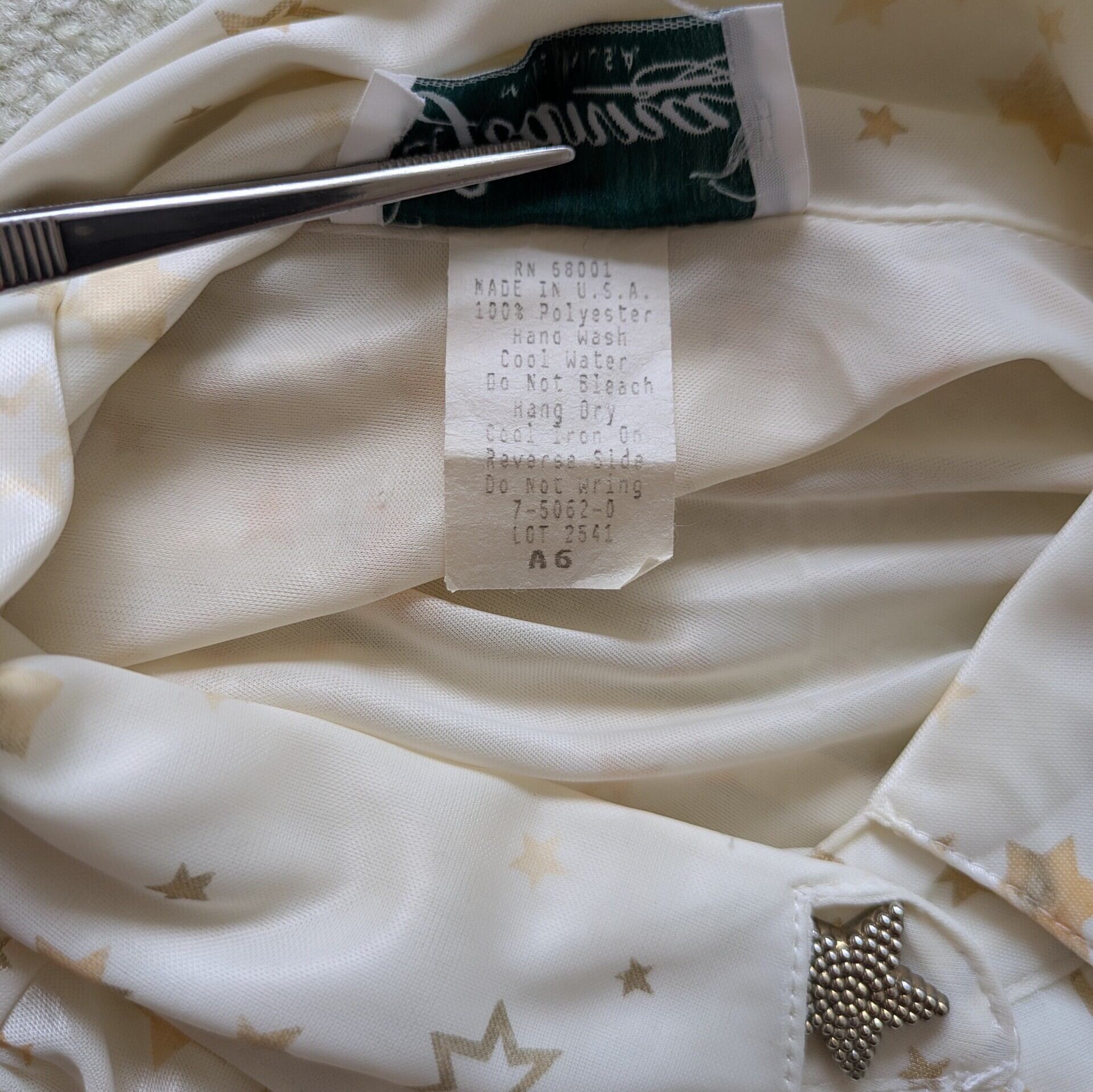 オフホワイトにゴールドの星柄プリントと大きな星のボタンが個性的なブラウスです。