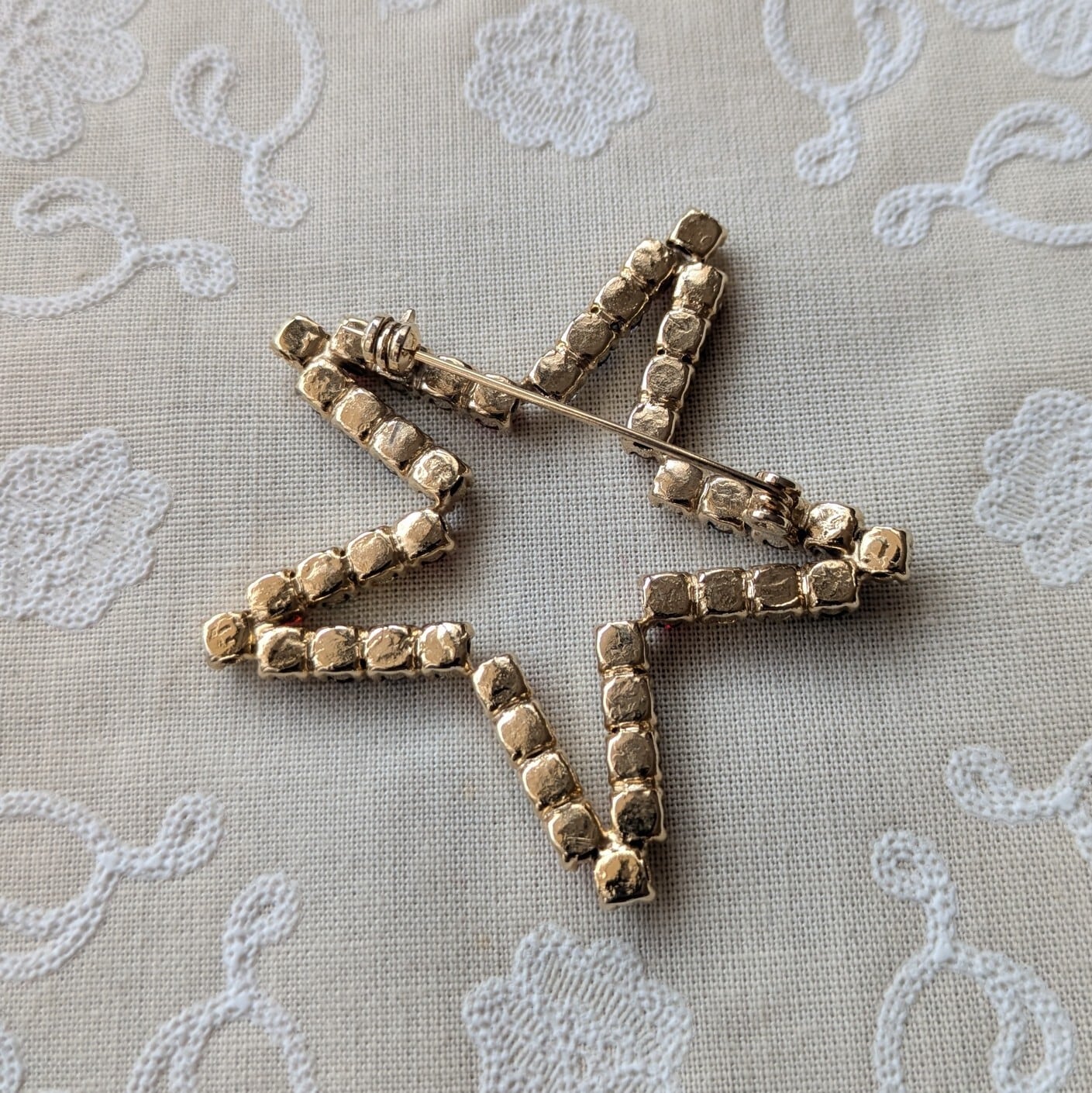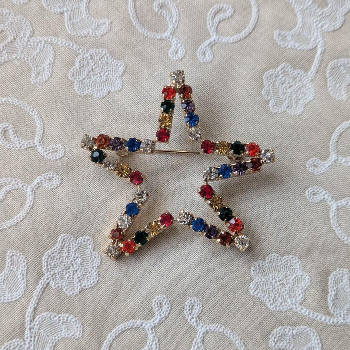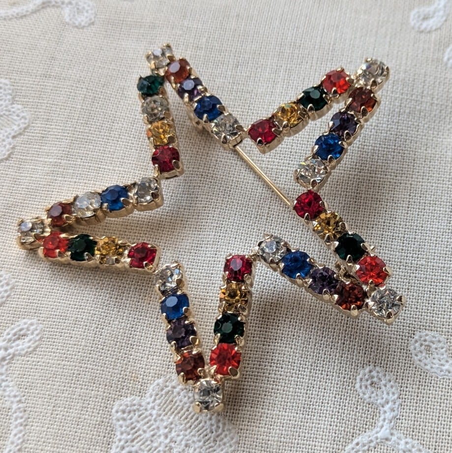 ゴールドにカラフルなラインストーンの星の形のブローチです。