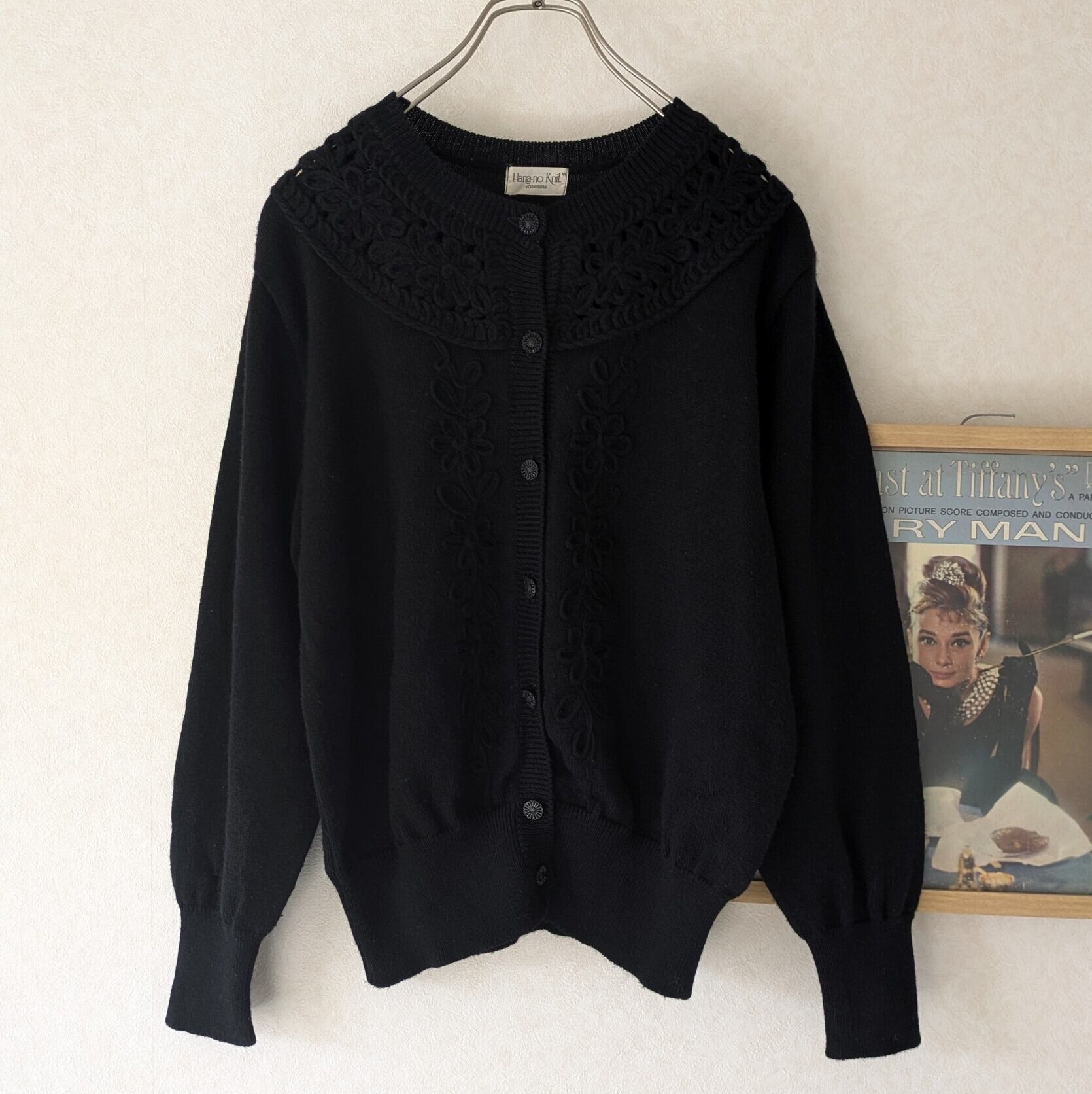 フロントの透かし編みとコード細工がレトロなカーディガンです。