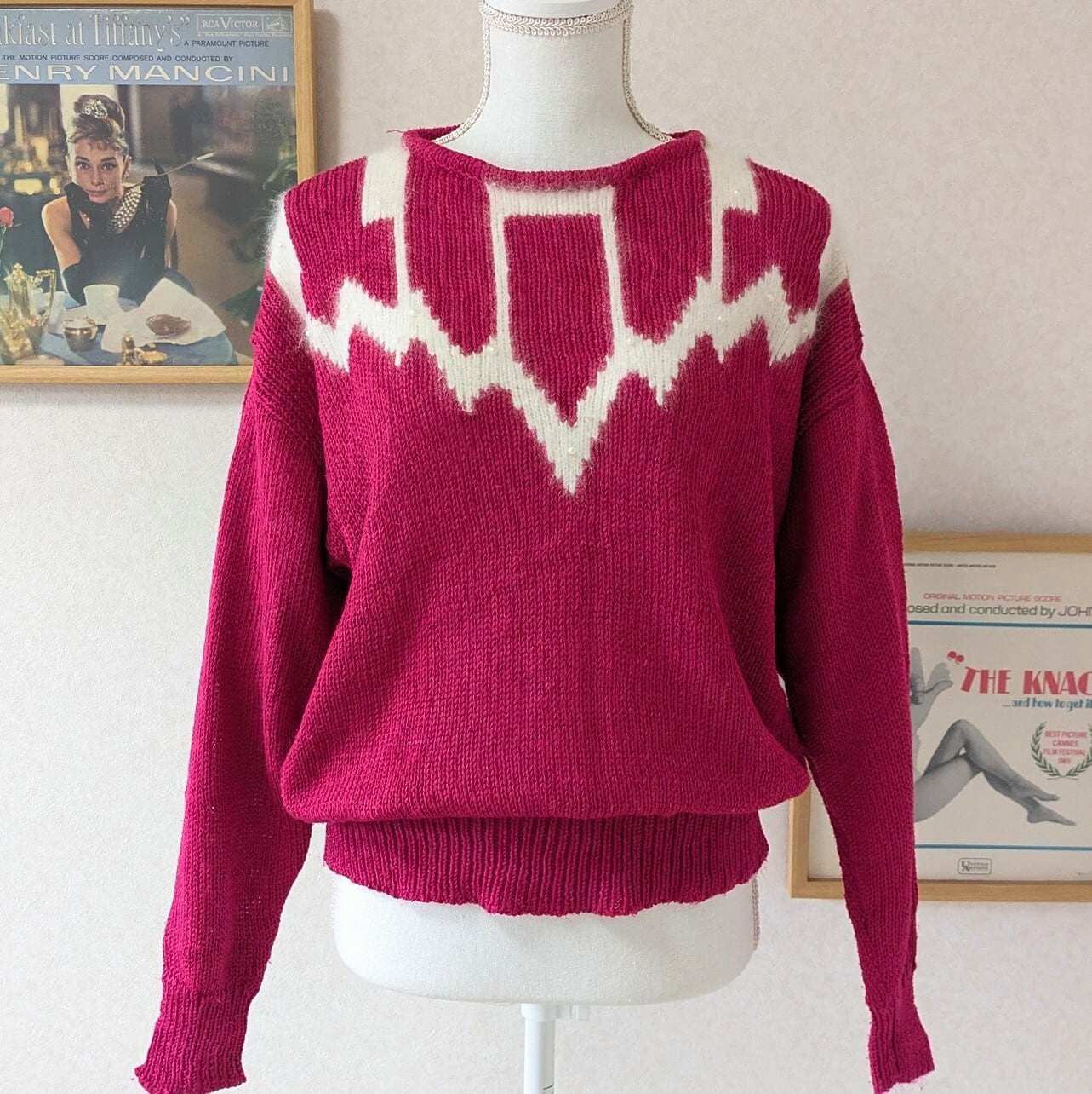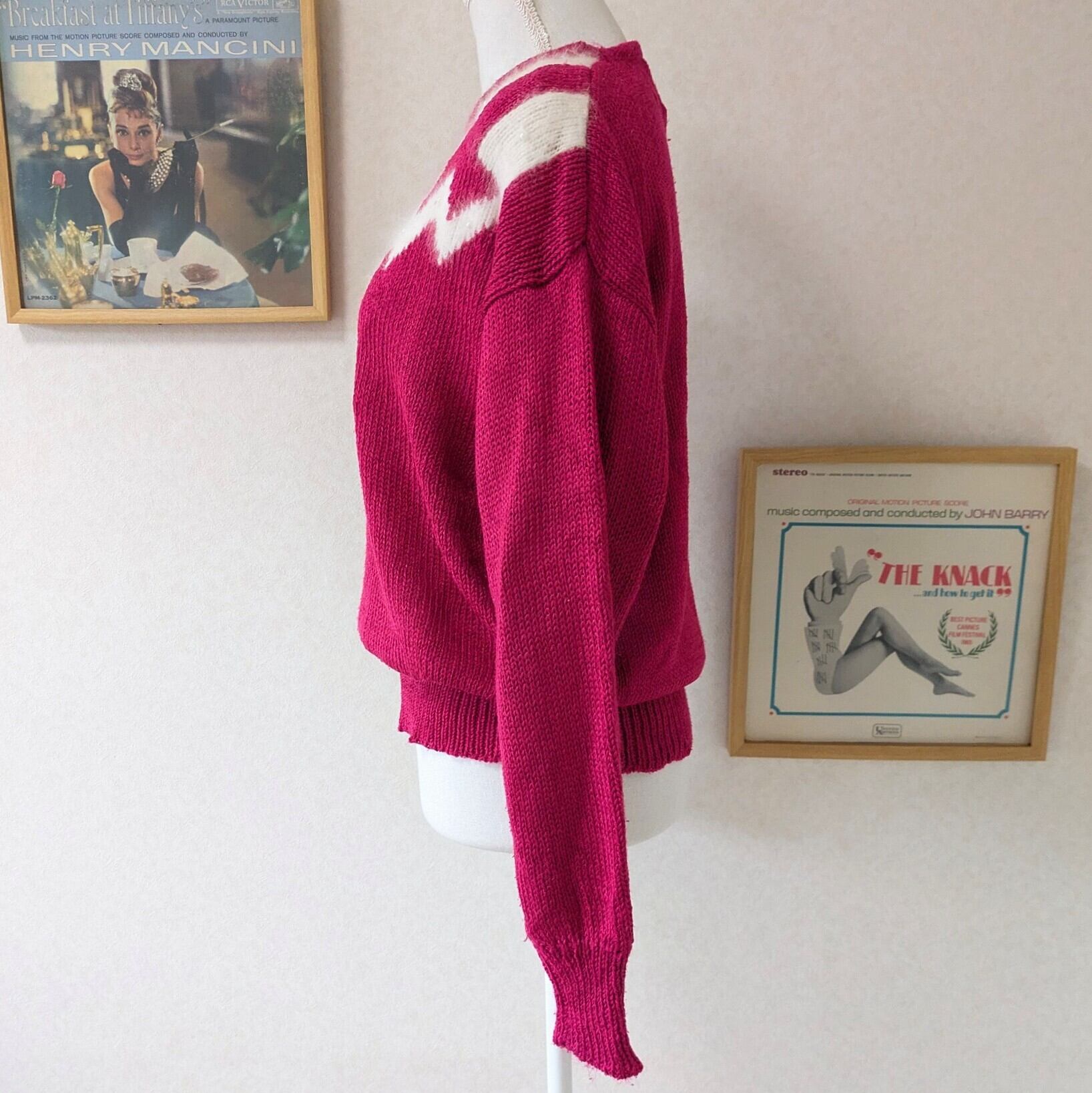 鮮やかなピンクに白いもけもけの柄が入ったレトロなニットです。