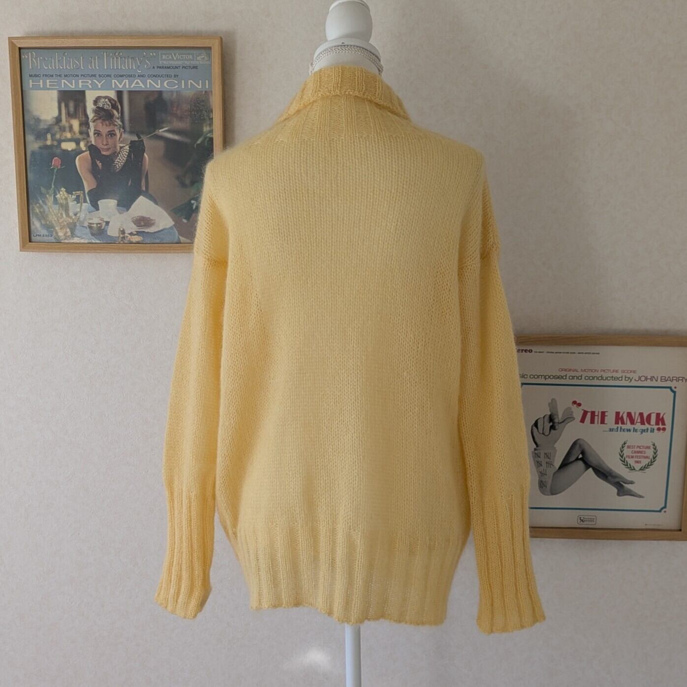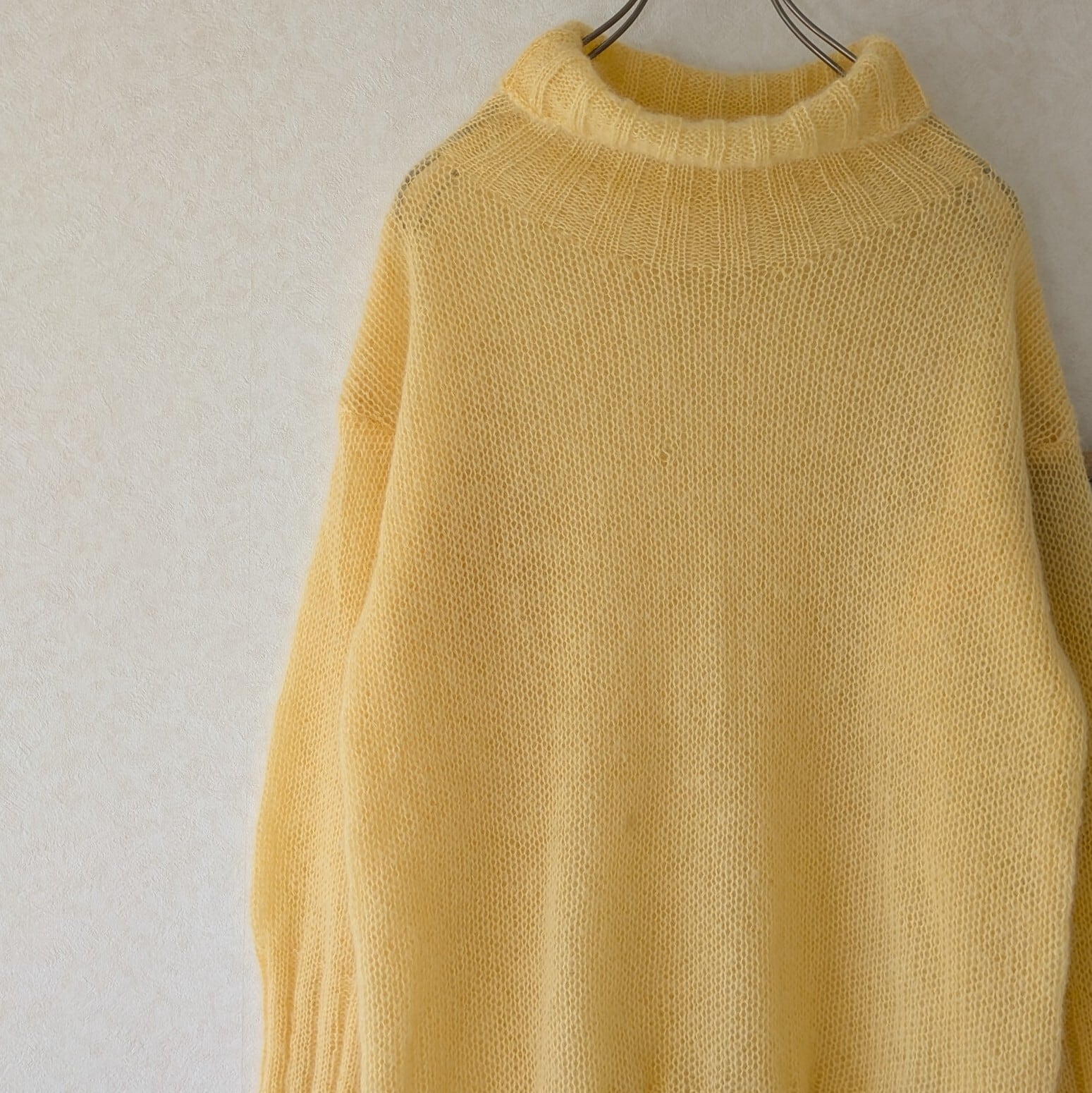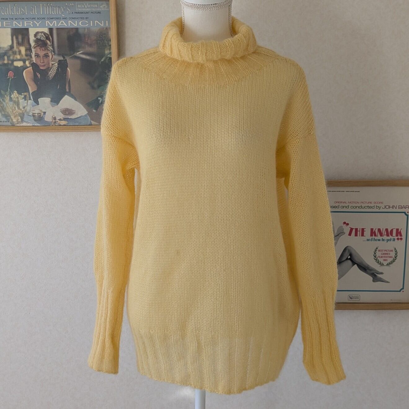 レモンイエローの優しいお色でゆるいタートルと袖口の長いリブがポイント。