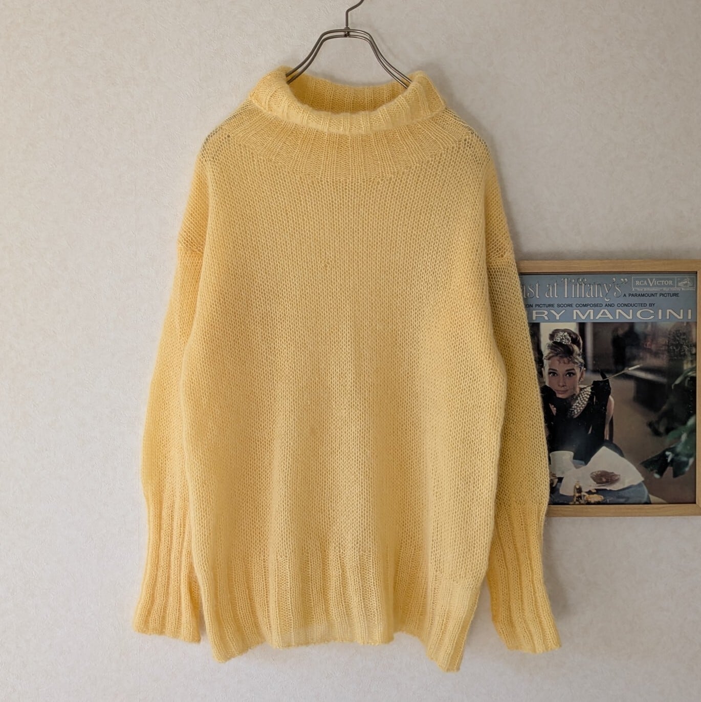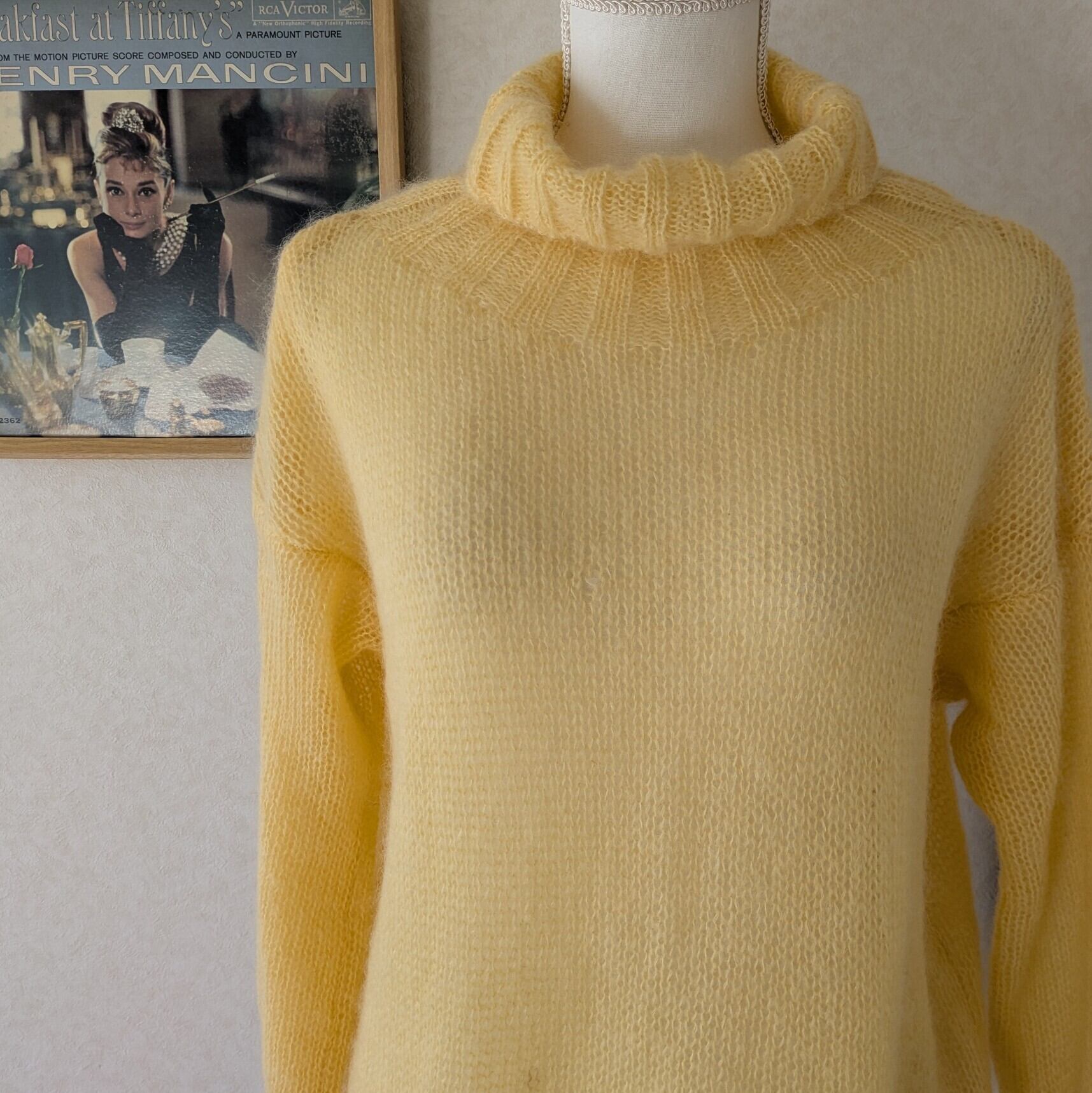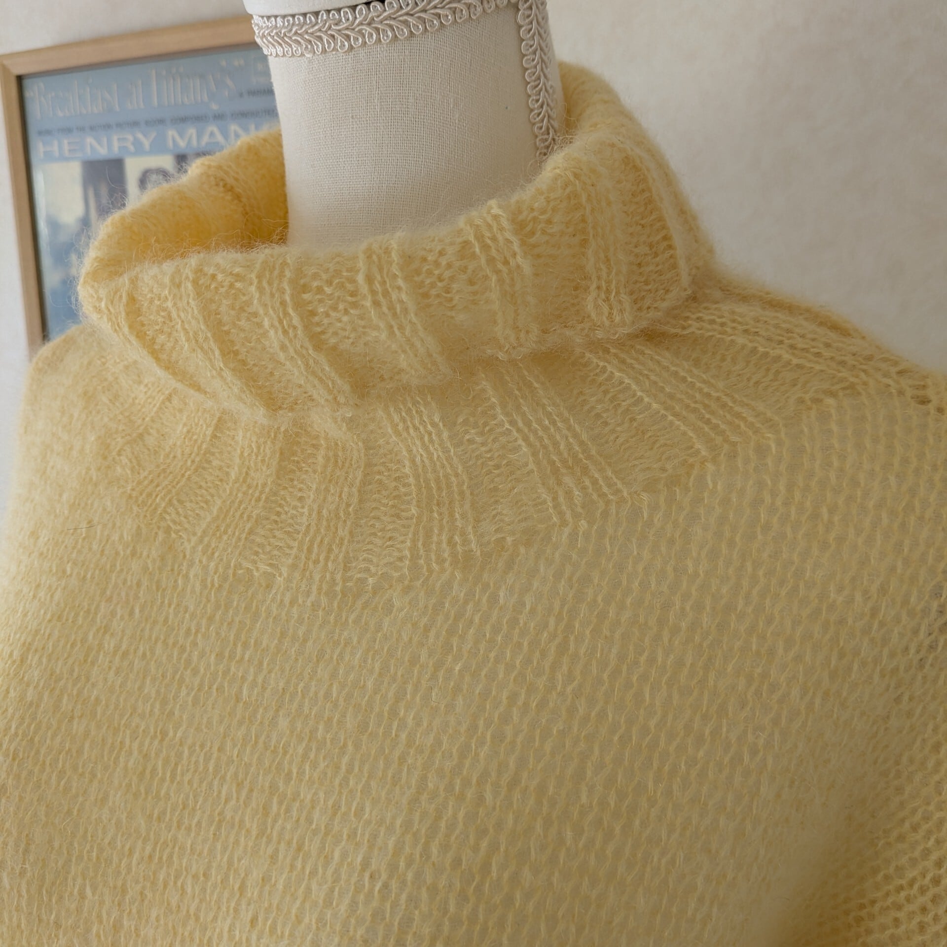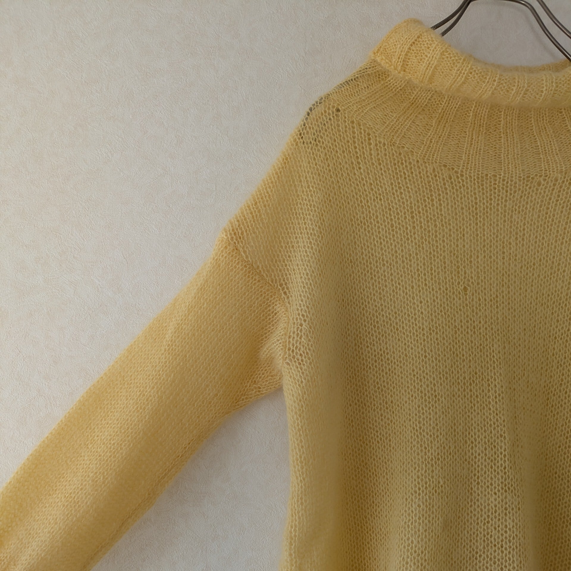 レモンイエローの優しいお色でゆるいタートルと袖口の長いリブがポイント。