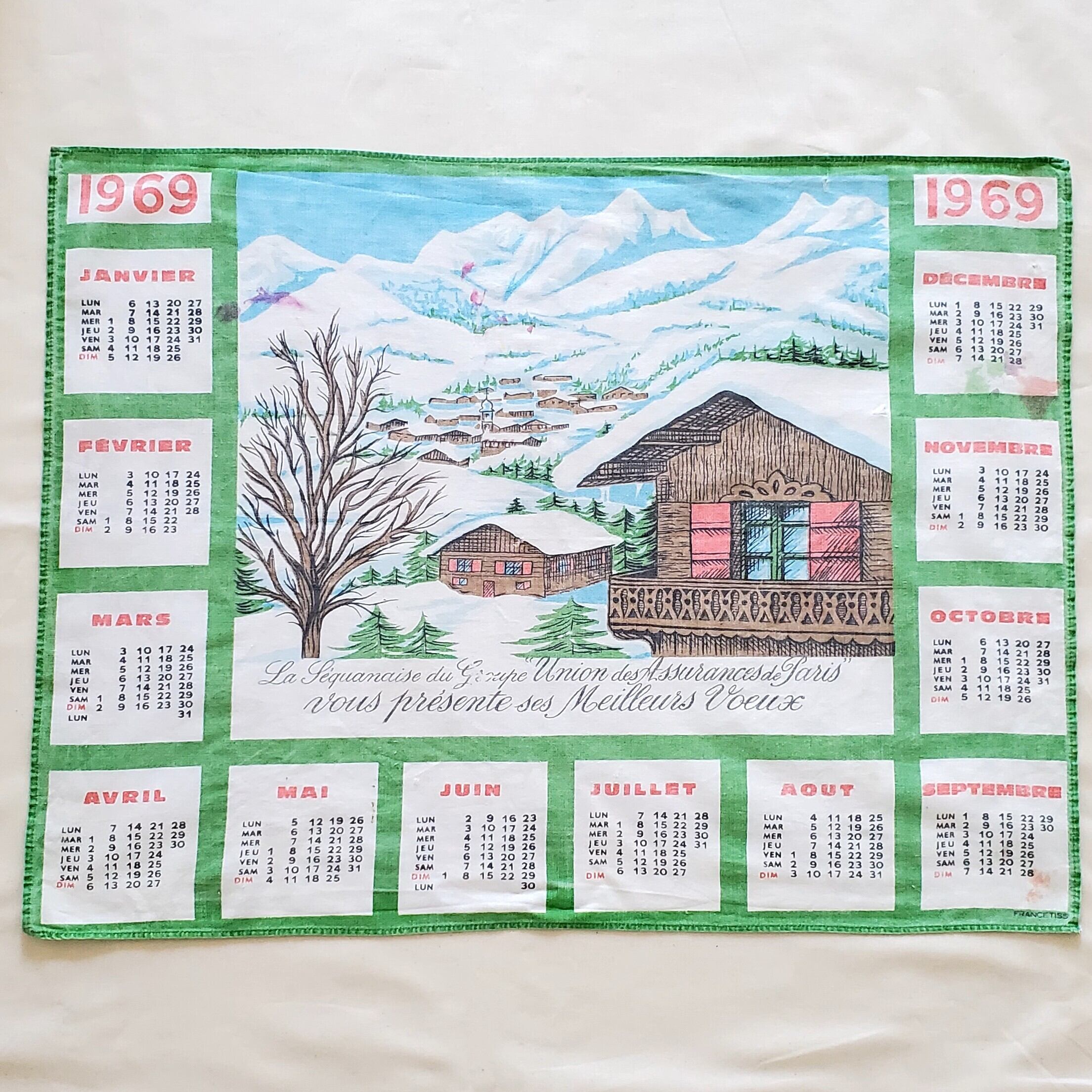 【1969年】ファブリックカレンダー タペストリー ウォールデコレーション 雪の風景