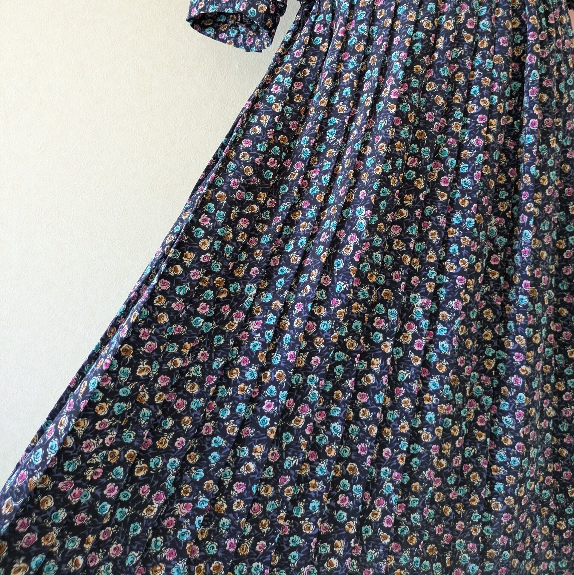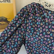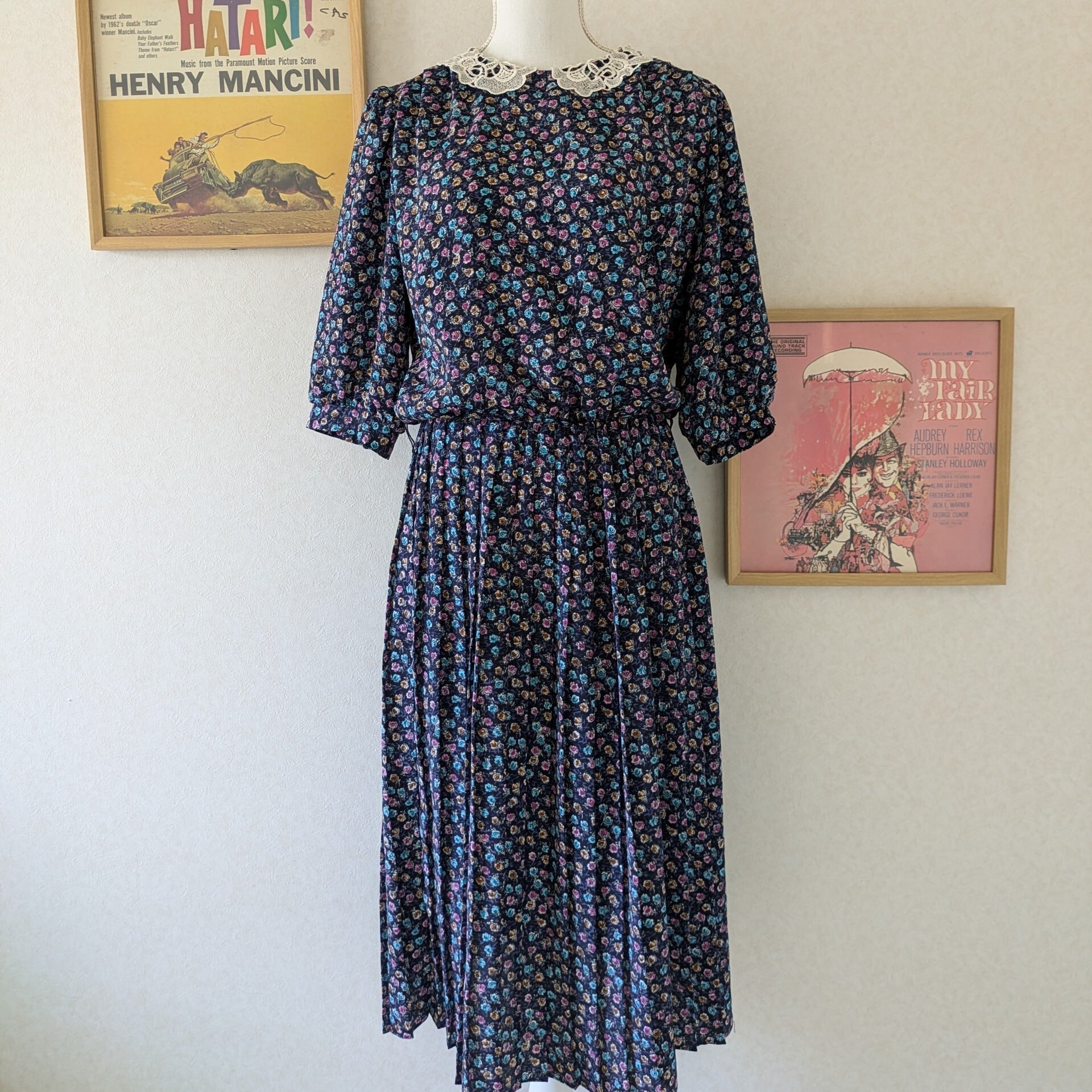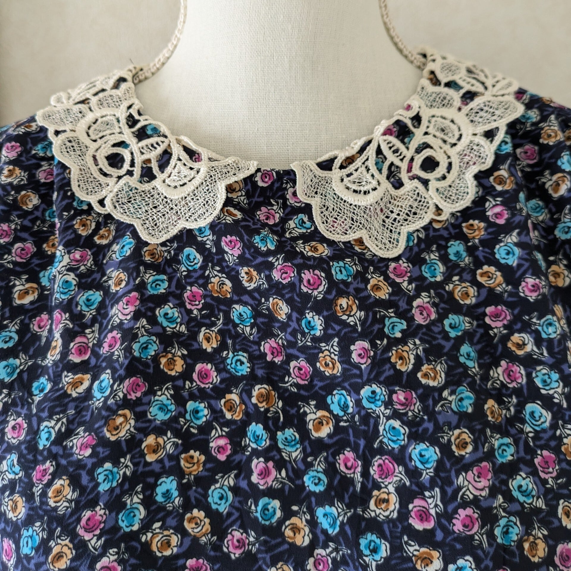 ネイビーにブルーとピンクの花柄と白いレースの襟がクラシカルな一着。