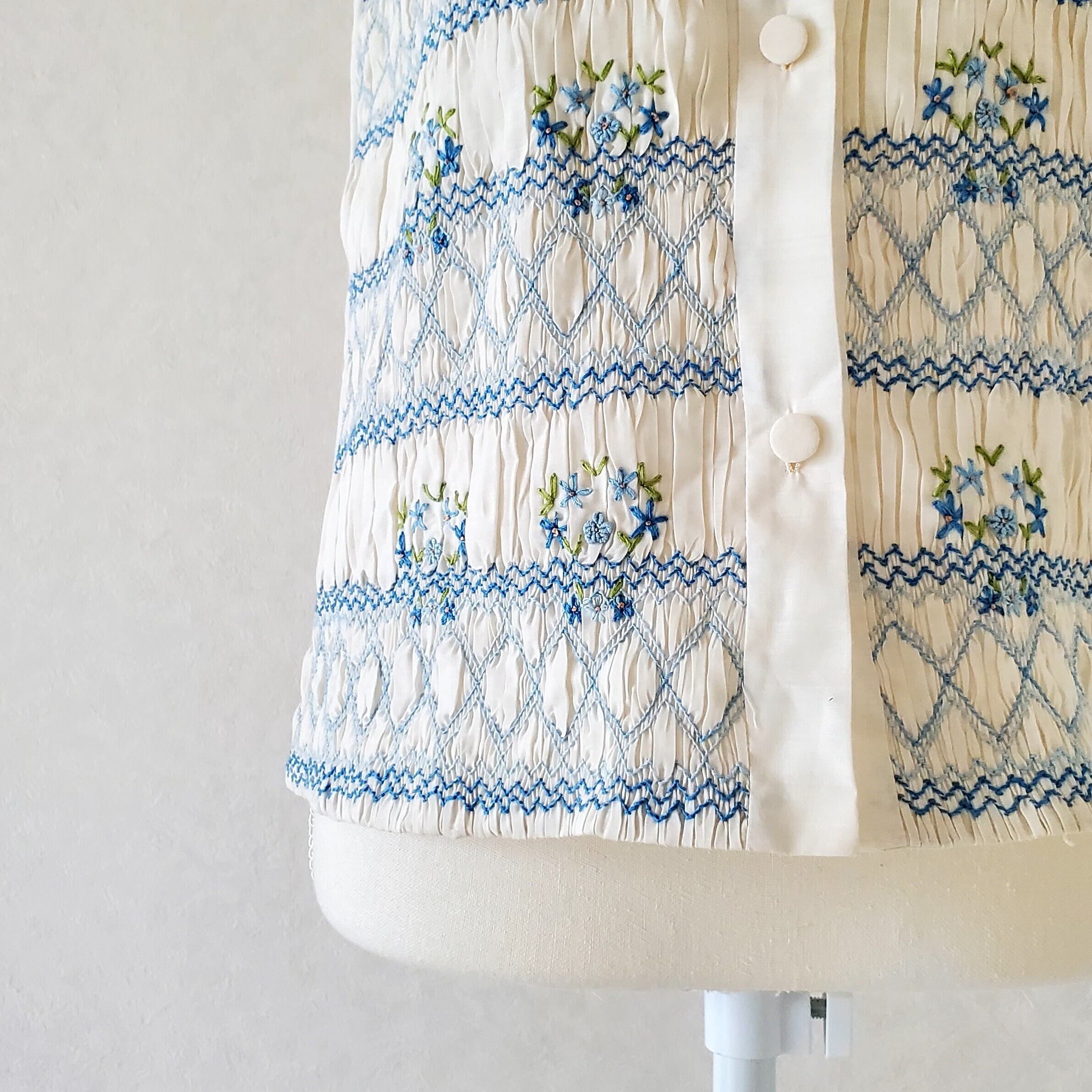 細かく入ったギャザーとブルーのお花の刺繍がとてもキレイです。