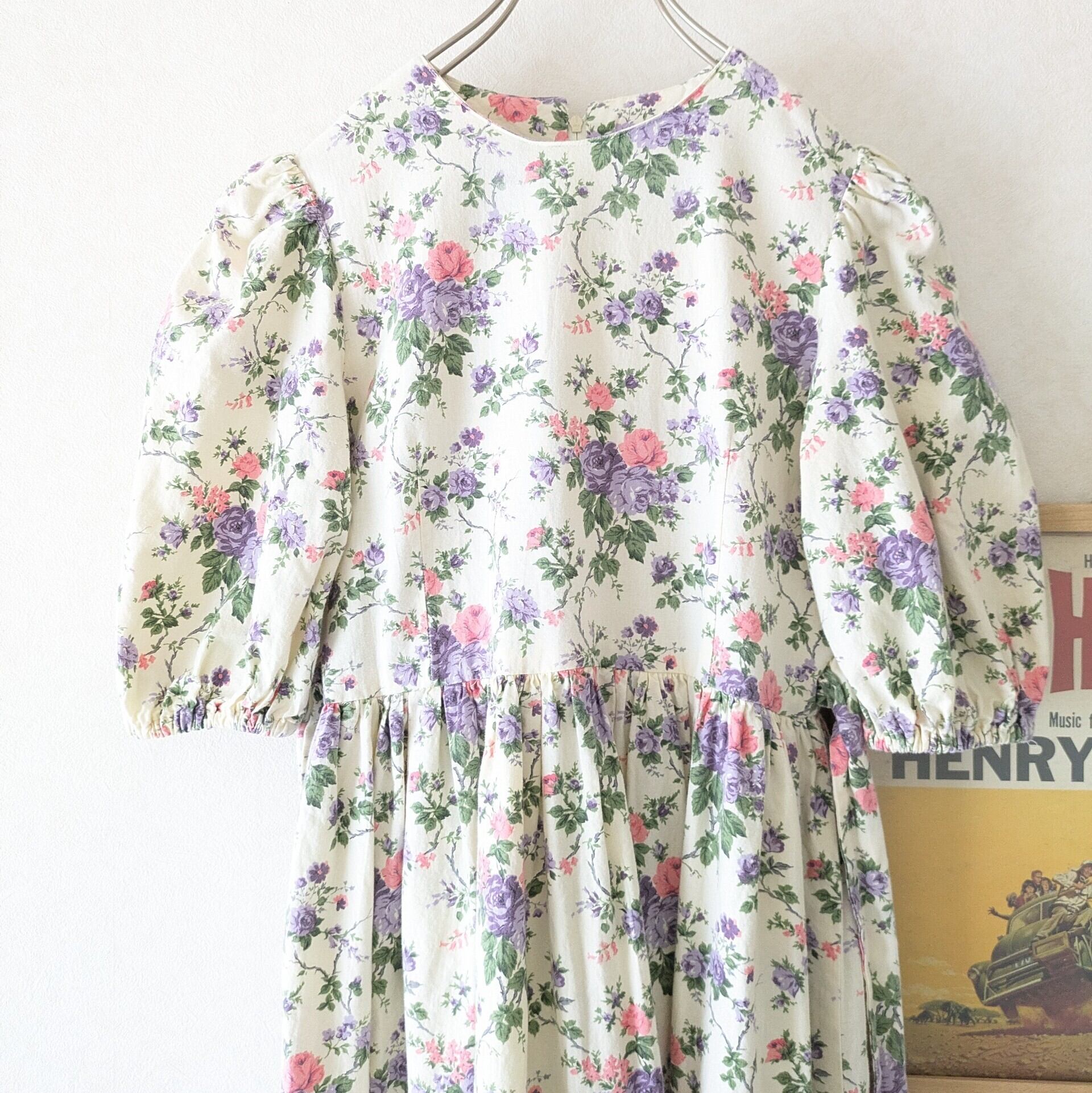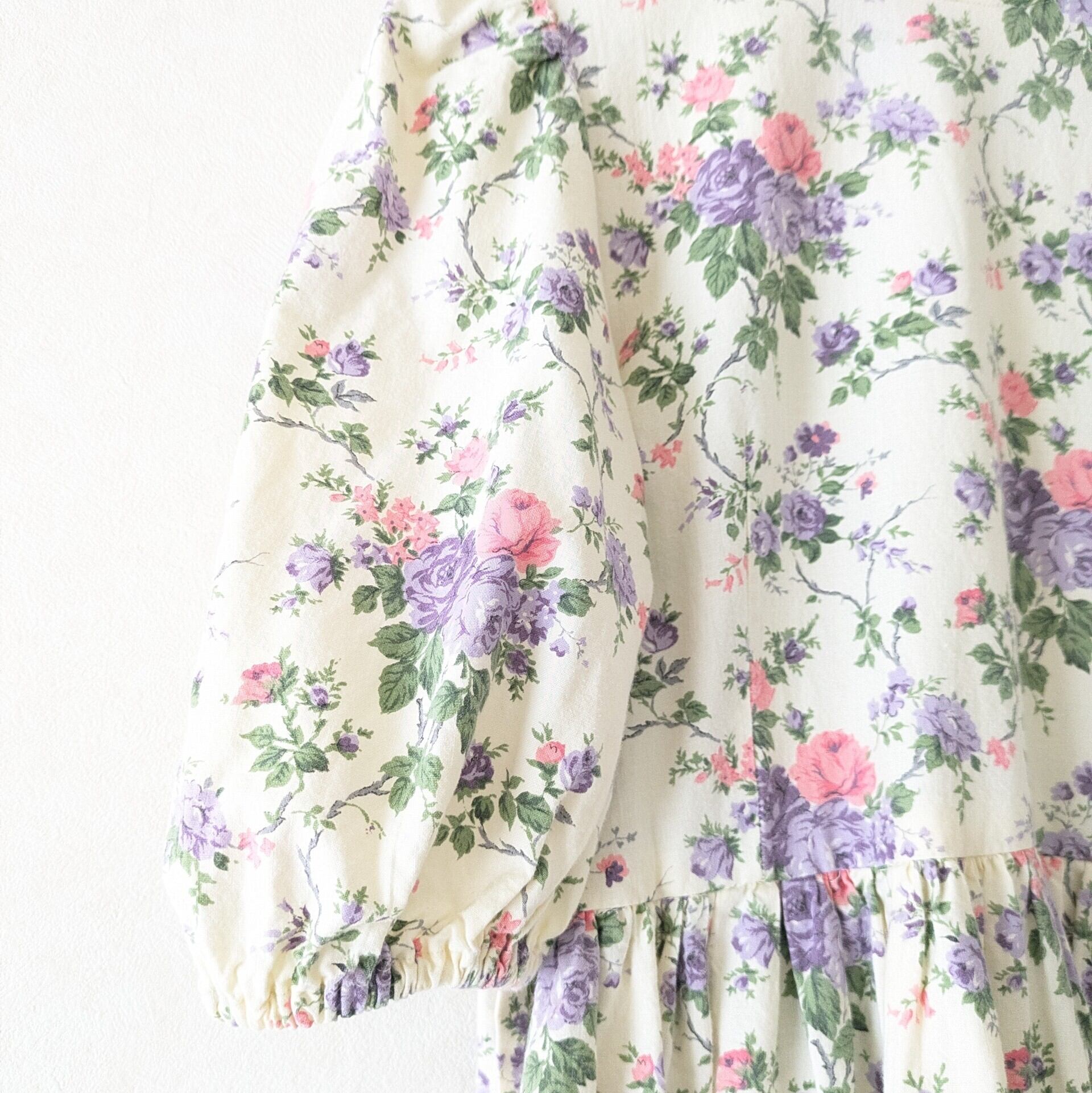 ローラアシュレイ風の花柄の生地はフランネルのように少ししっかりとした素材なので、バルーンスリーブやウエストのリボンなどにハリが出て形がとてもきれいです。