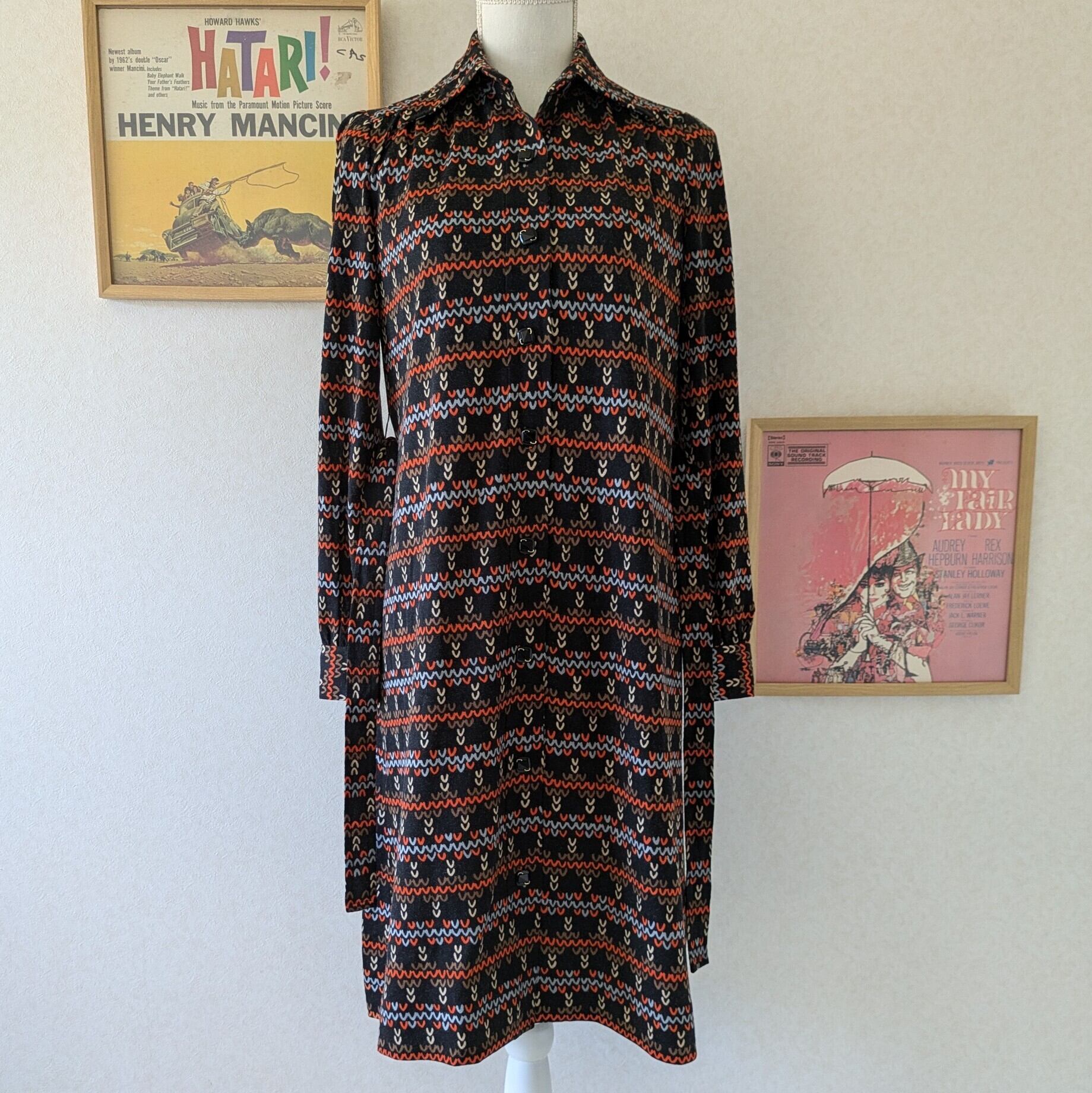 ブラックベースのレトロ柄ワンピースです。