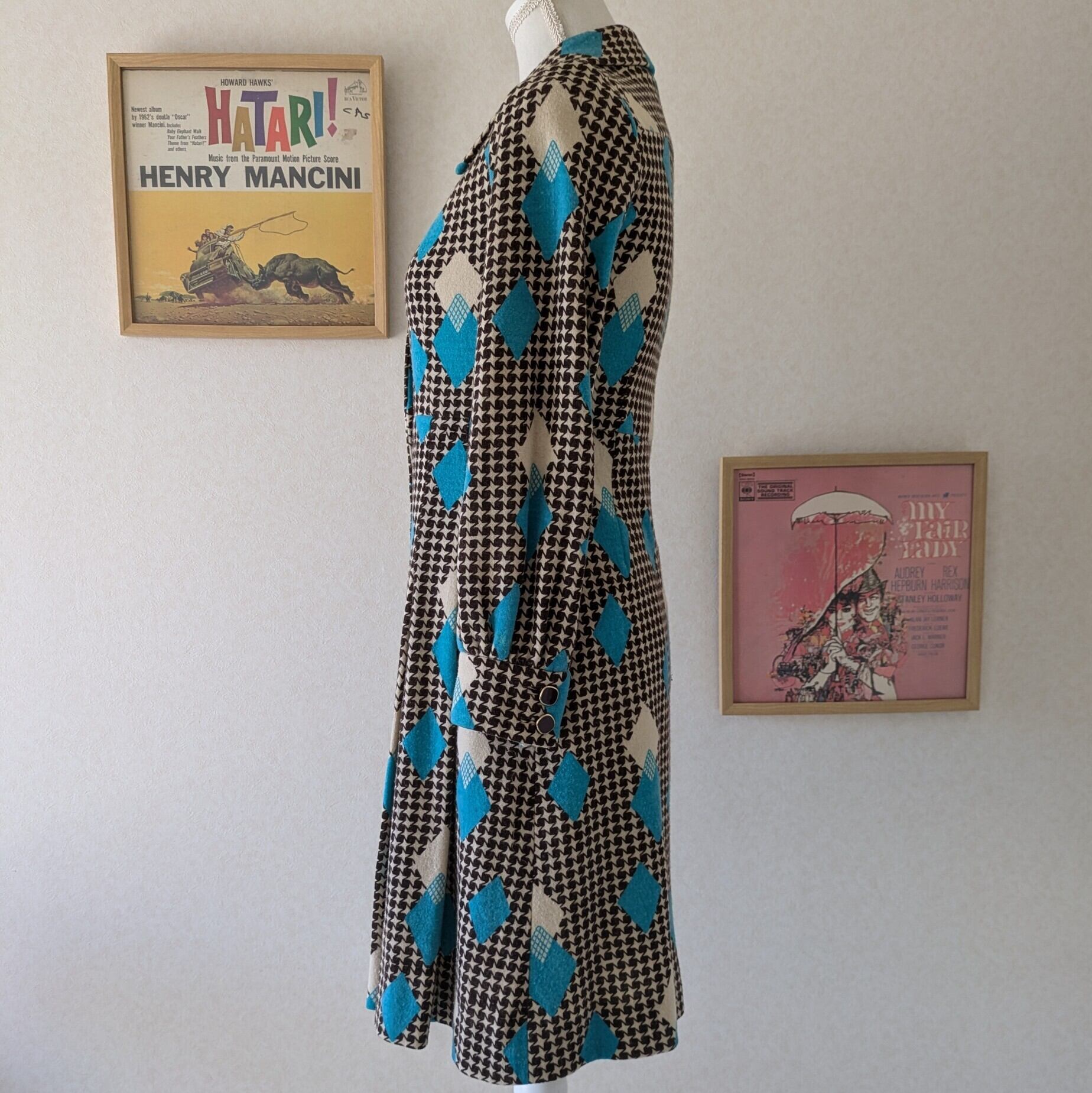 少しけばけばしたウール地の千鳥柄をベースに、白とブルーのダイヤ柄が大きく入ったレトロな雰囲気のワンピースです。