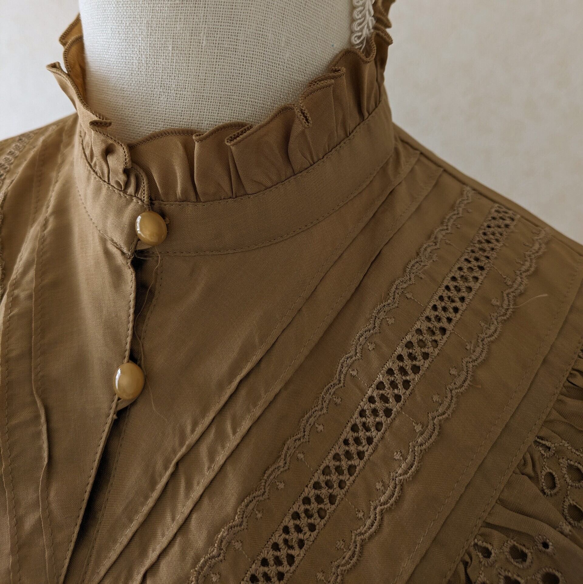 【東京ブラウス】ブラウンフリルブラウス スタンドカラー サイズM程度 レディース 古着