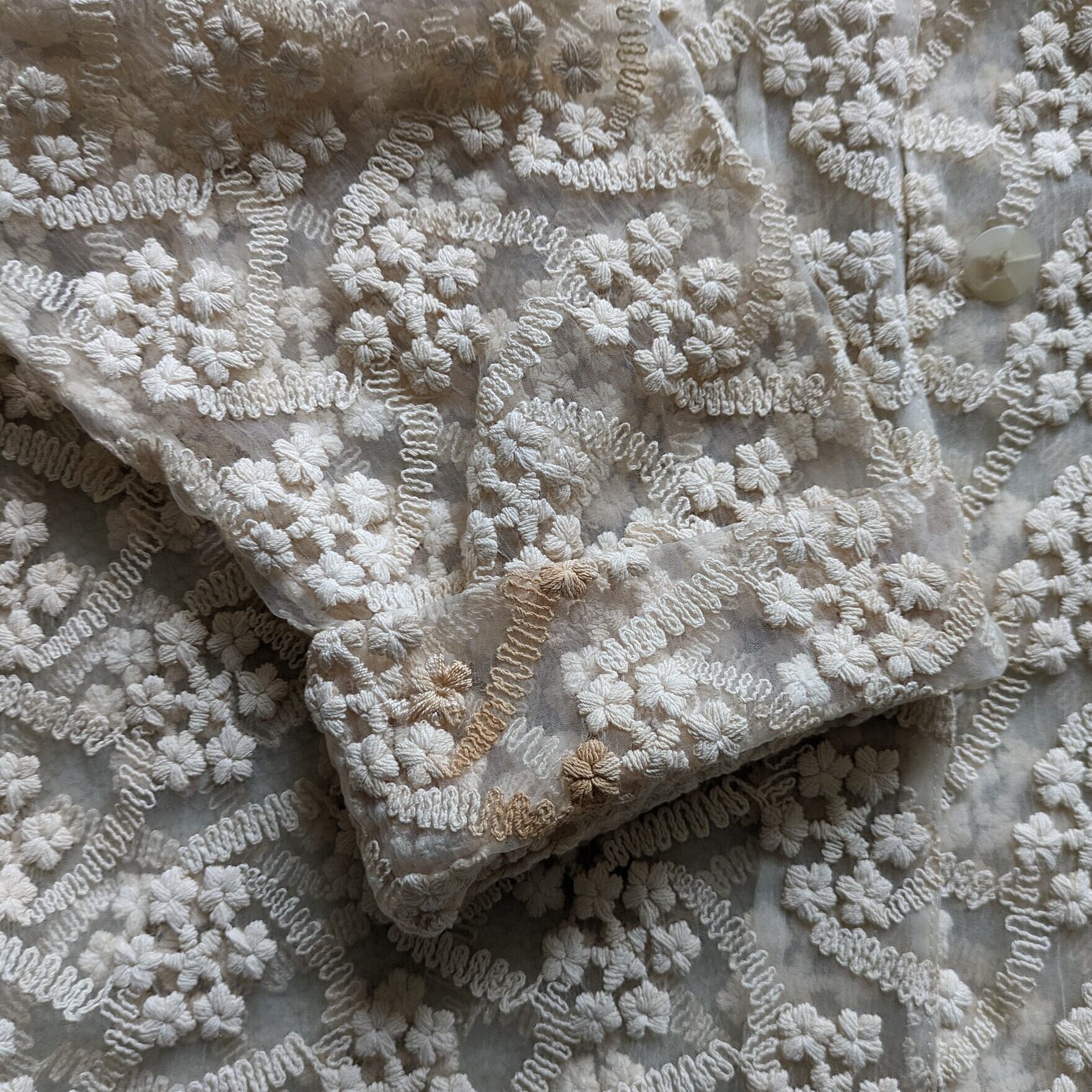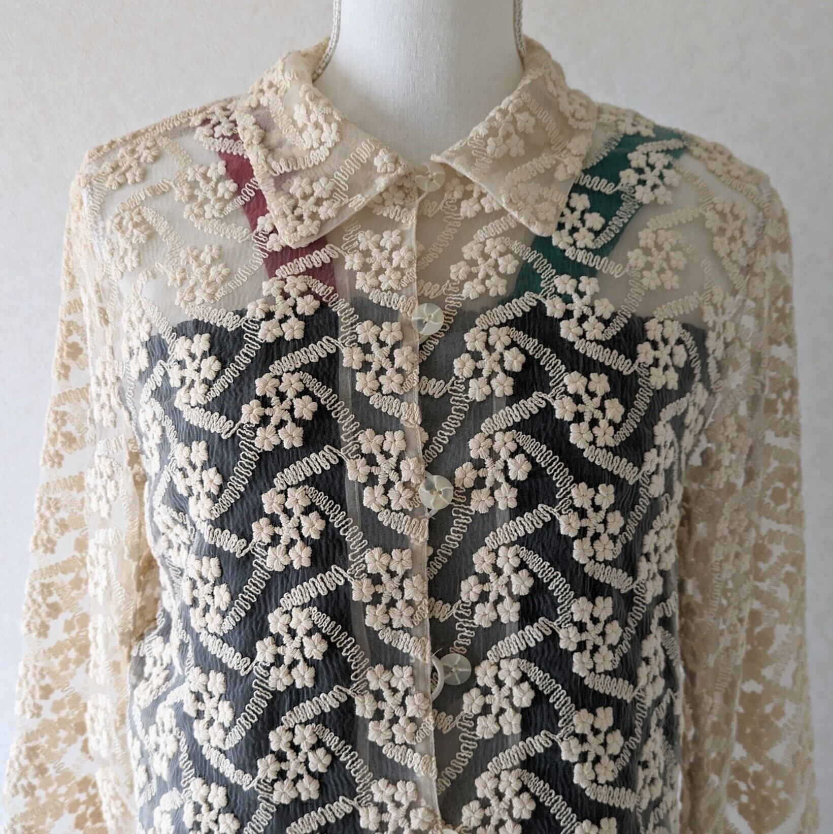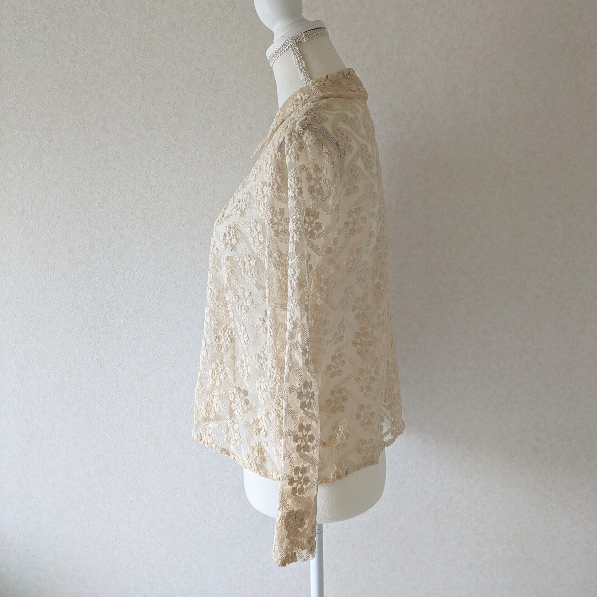 【シアーブラウス】レトロブラウス レース ホワイト 花柄 サイズM レディース 古着