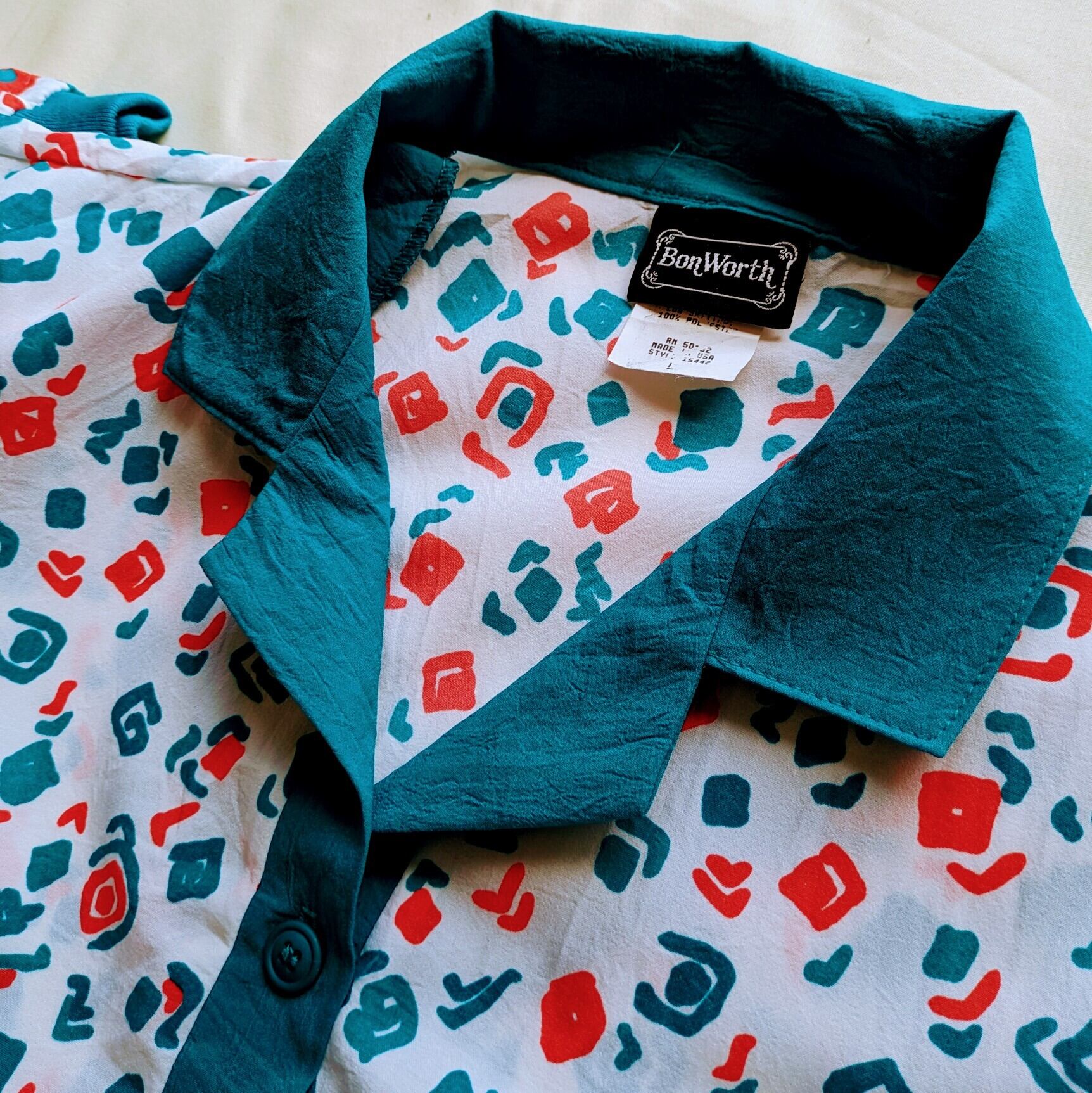 白地にうずまきのような柄で襟とリブはエメラルドグリーンと、細部まで古着らしいデザインのアイテムです。