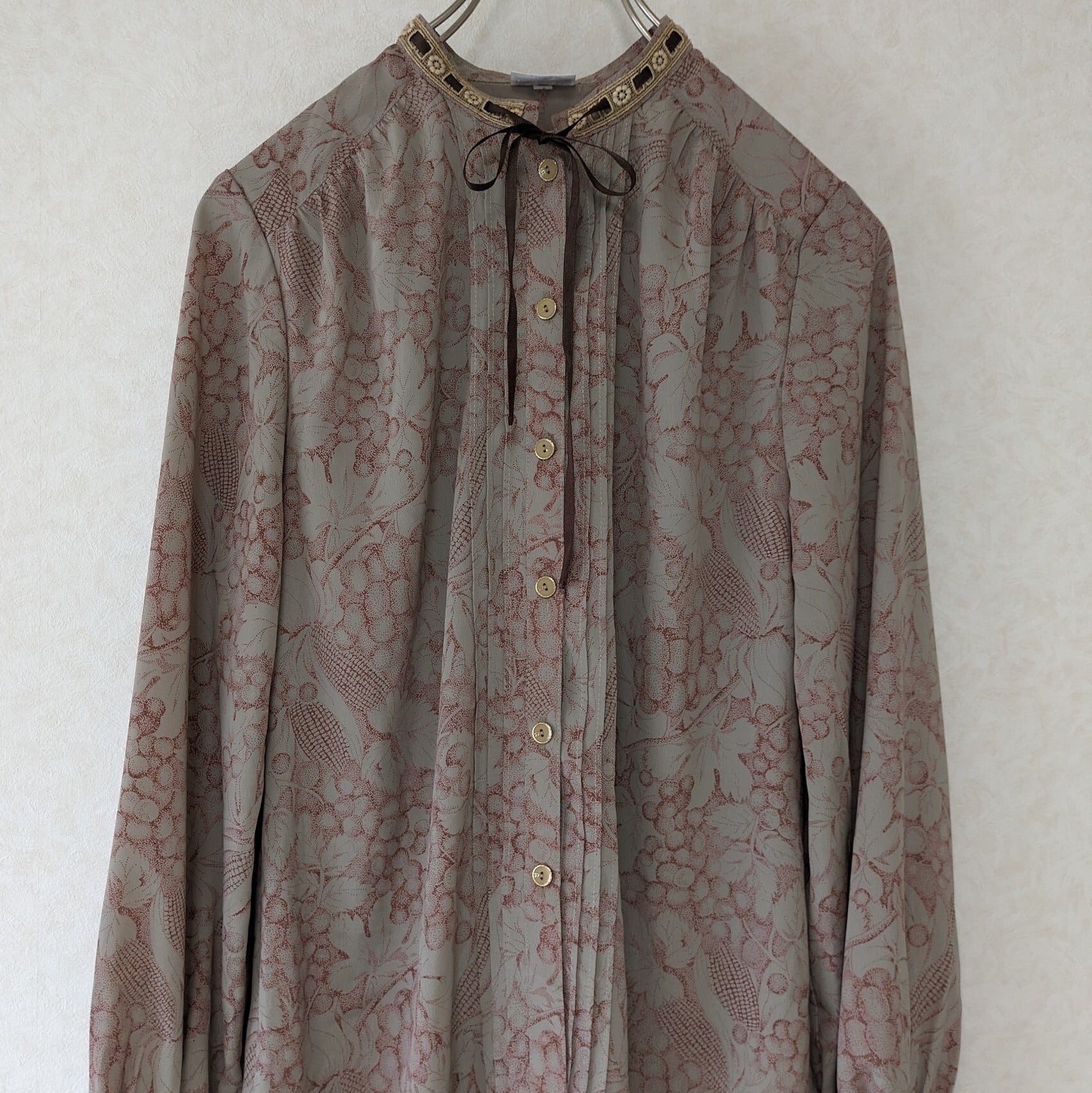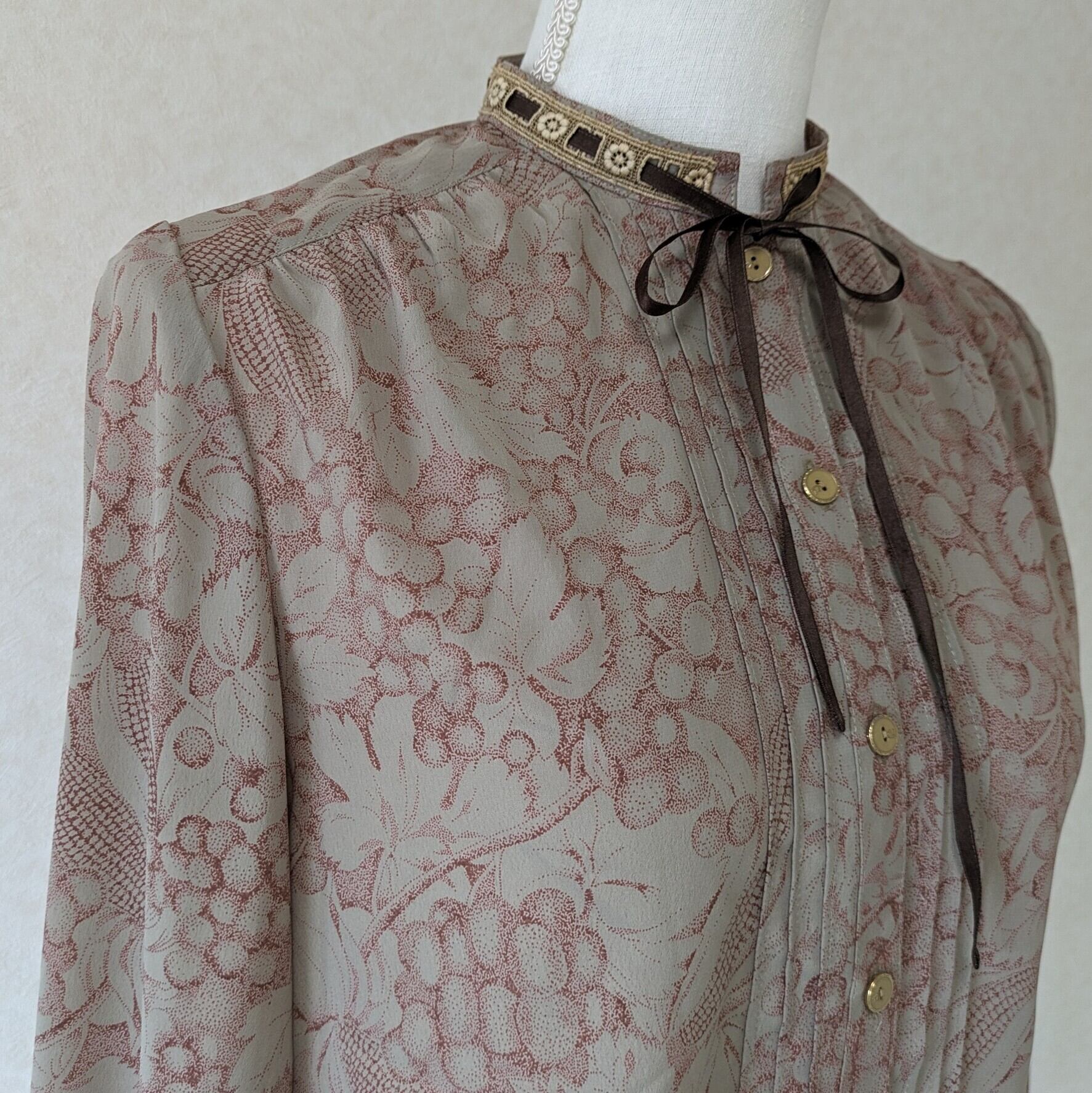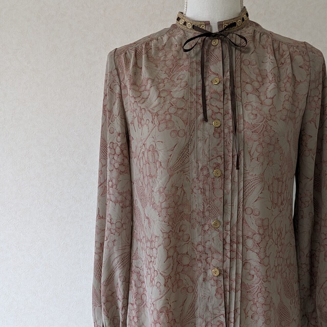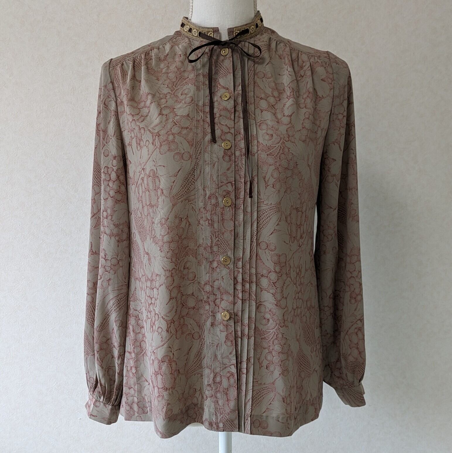 ベージュの地にブラウンの点描で描かれた花柄がシックでレトロなブラウス。