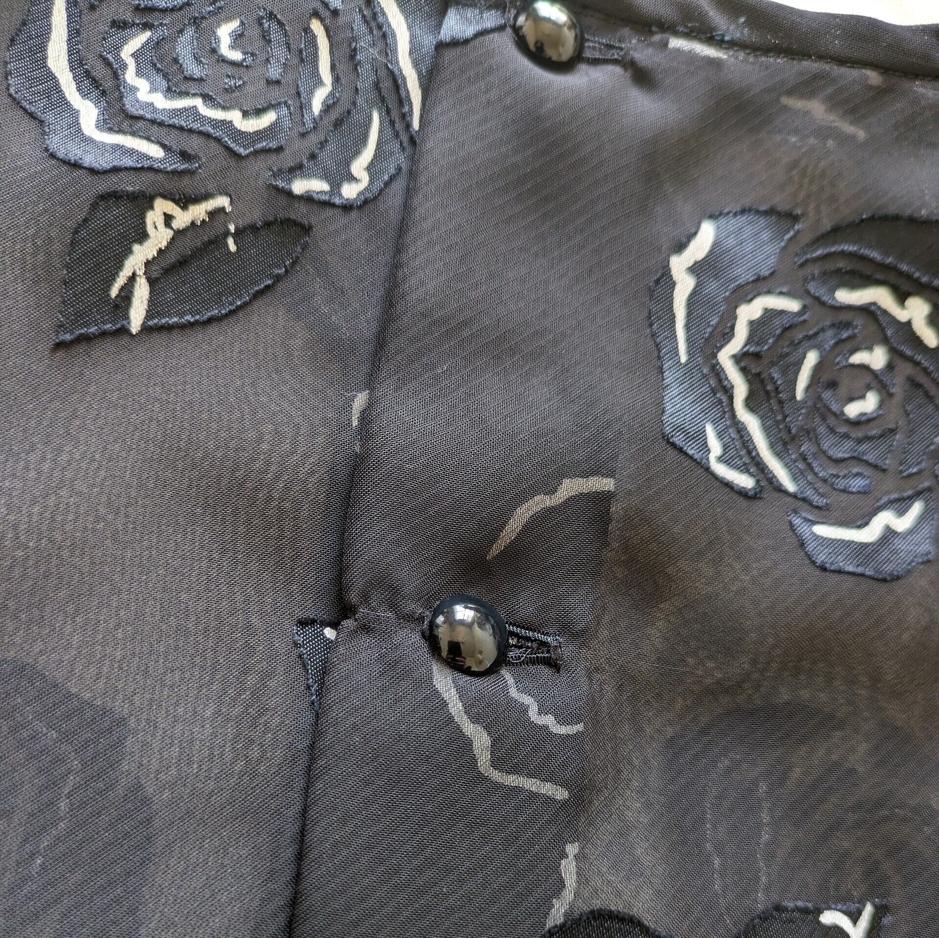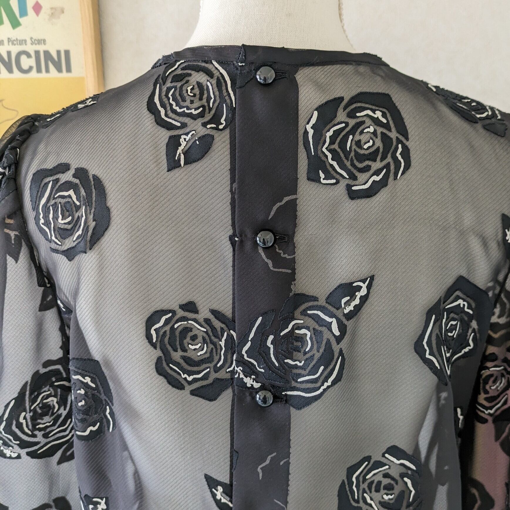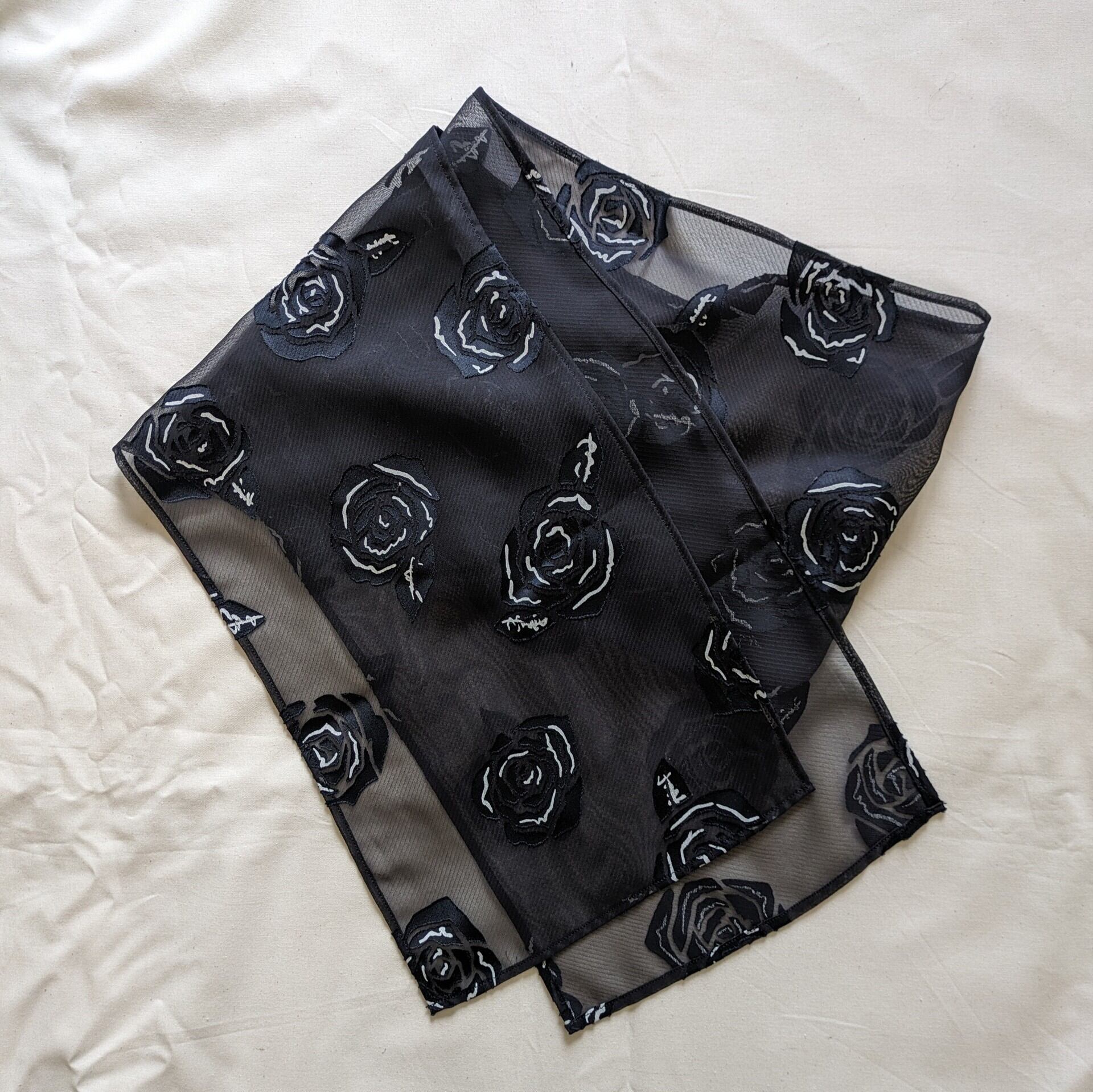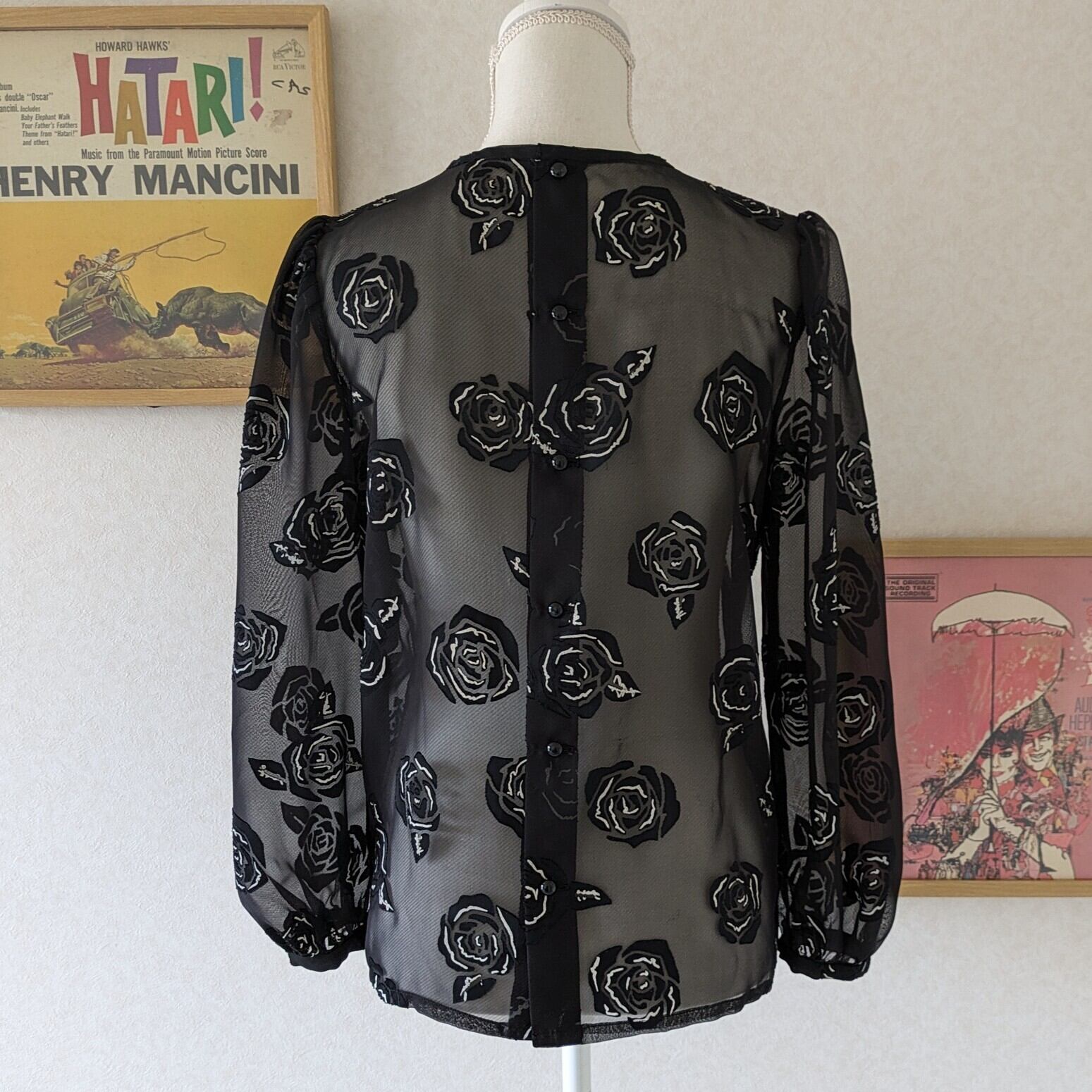 【昭和レトロ】レナウン ローズ柄 黒 シアーブラウス スカーフ付き サイズM〜L程度 used レディース古着