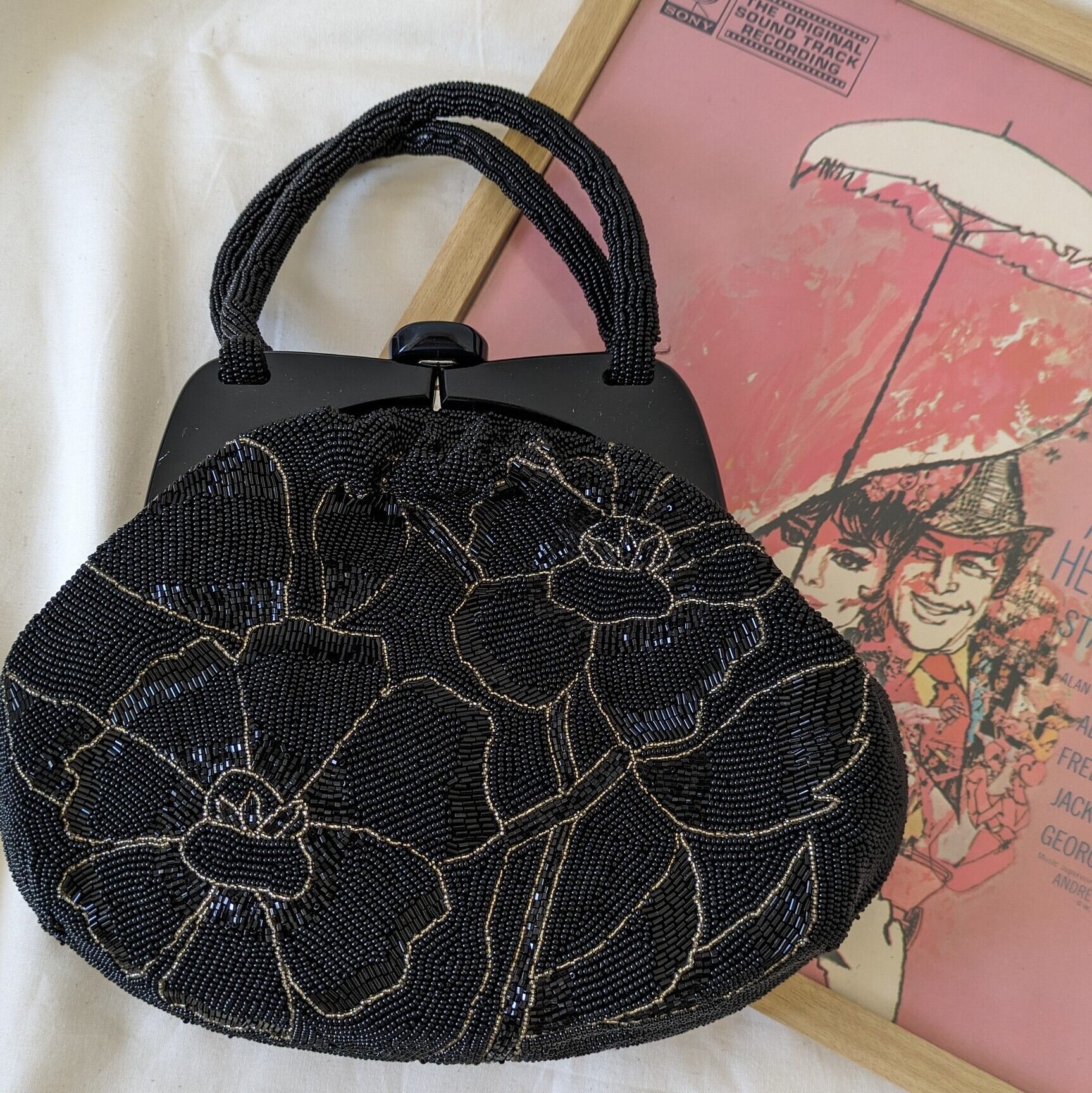 【ビンテージ】レトロ 花柄 がま口ビーズバッグ 黒 used レディース古着