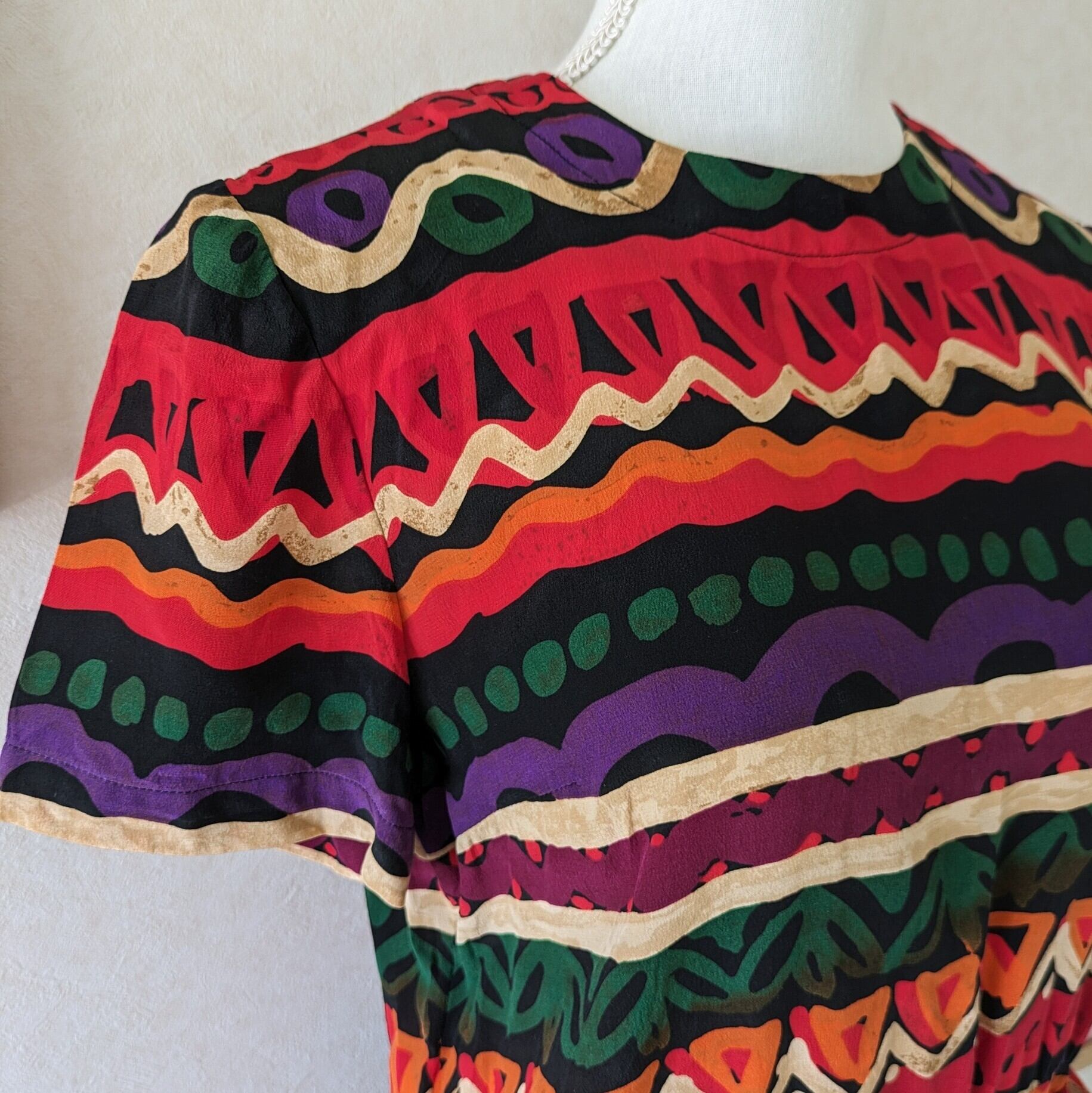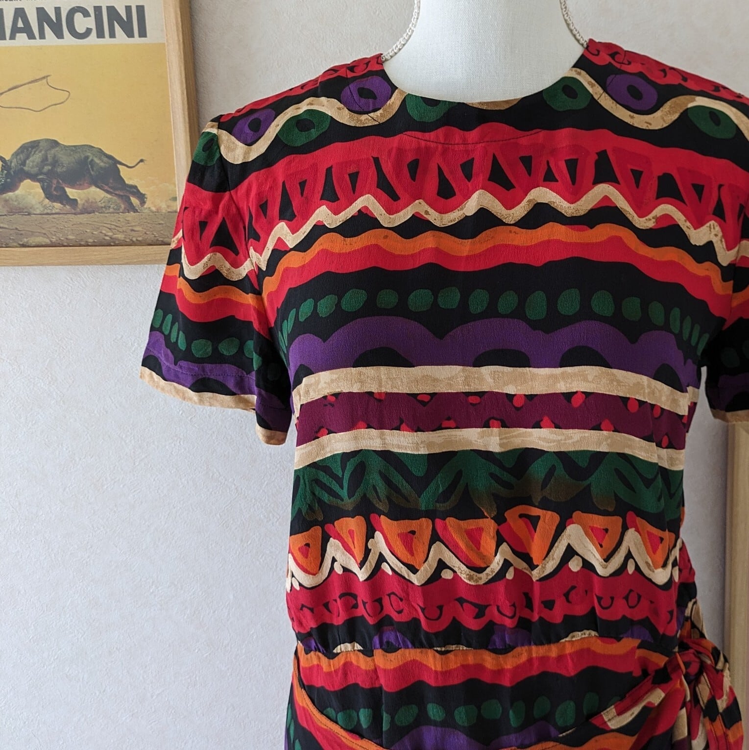 エスニックな柄にスカート部分が巻きスカートになっているレトロなデザイン。