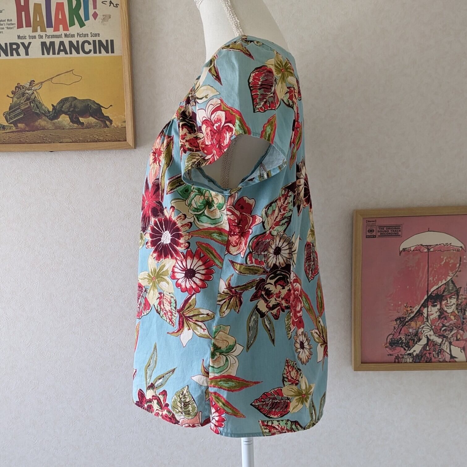 ブルーの地に大きな花柄がアロハみたいで涼しげ。