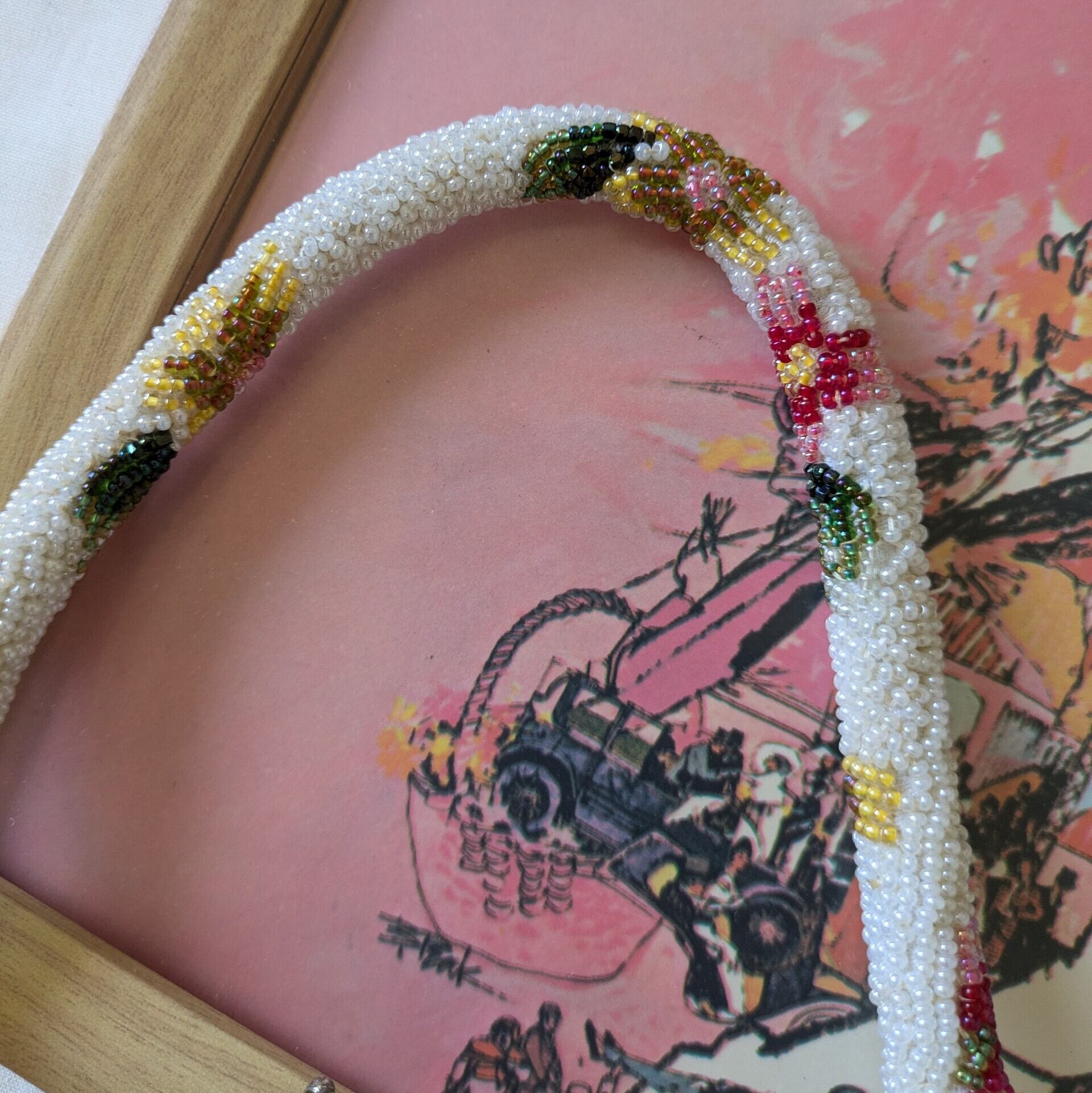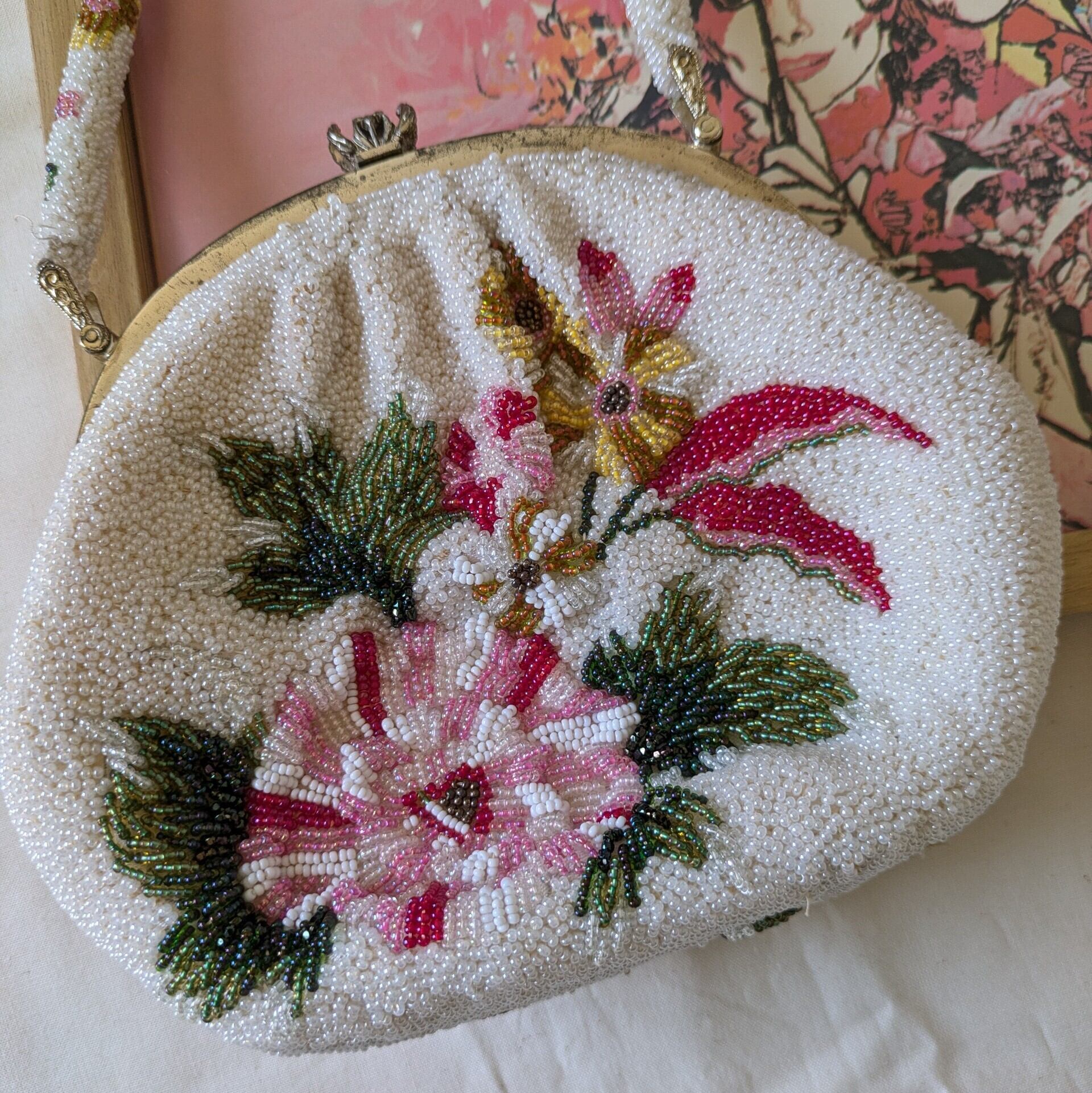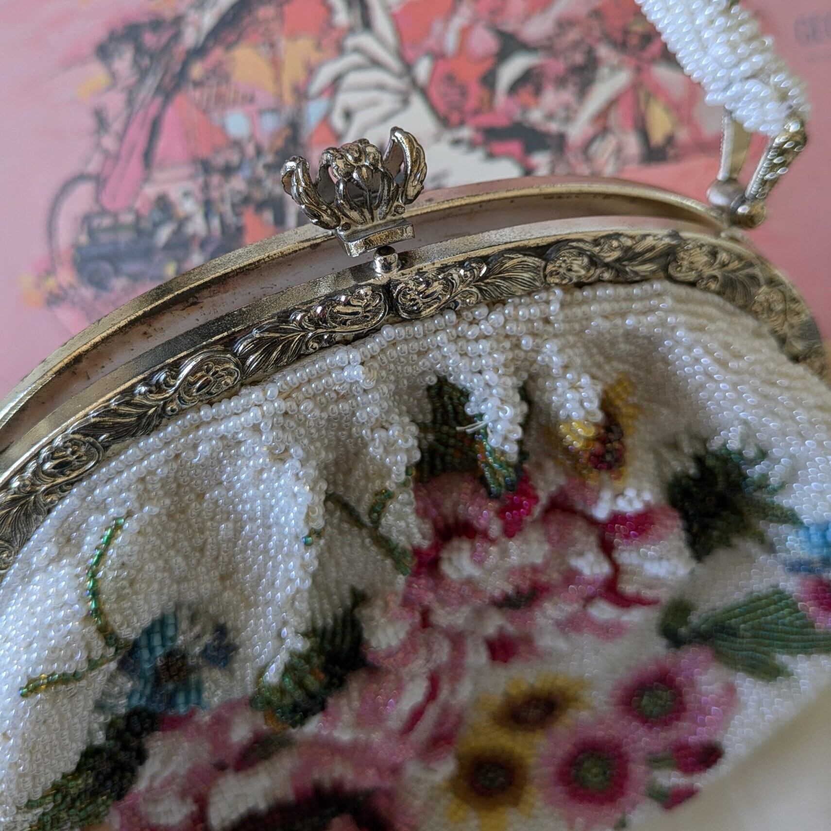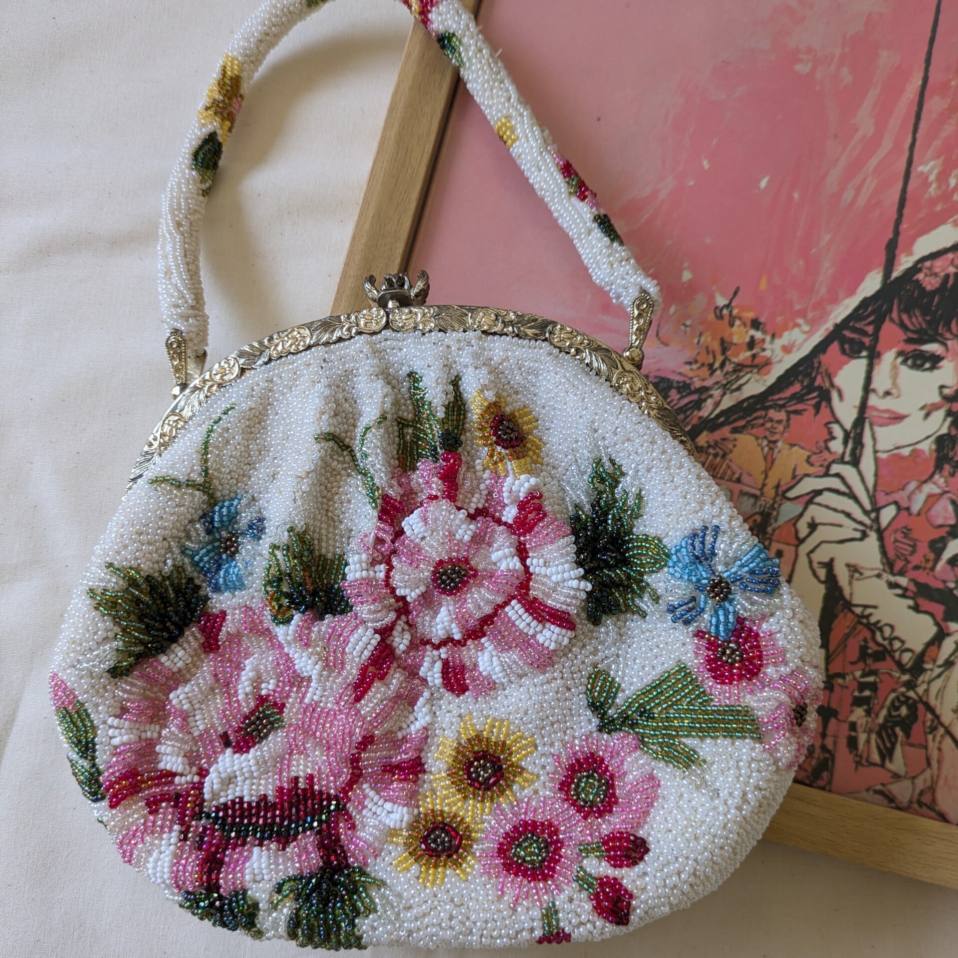 【ビンテージ】 レトロ ビーズバッグ白×ゴールド used レディース古着