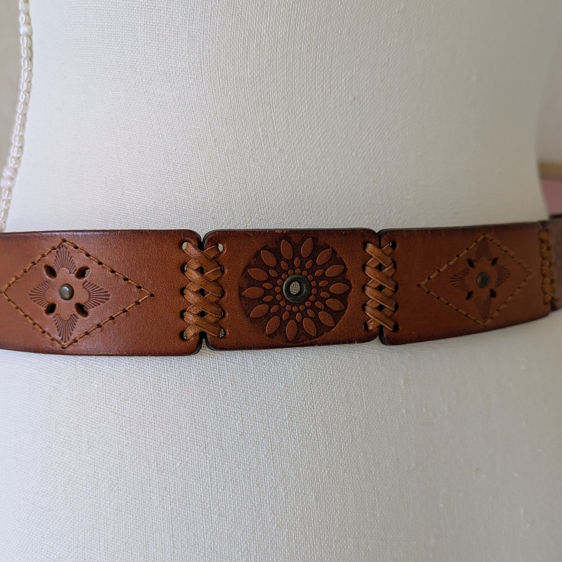 茶色のしっかりしたレザーにお花の型押しとモチーフ繋ぎが可愛い、珍しいデザインです。