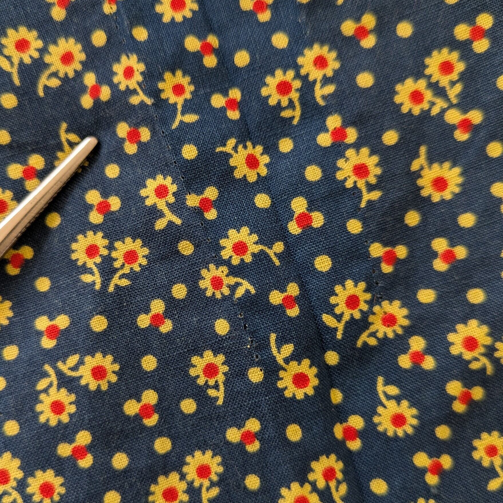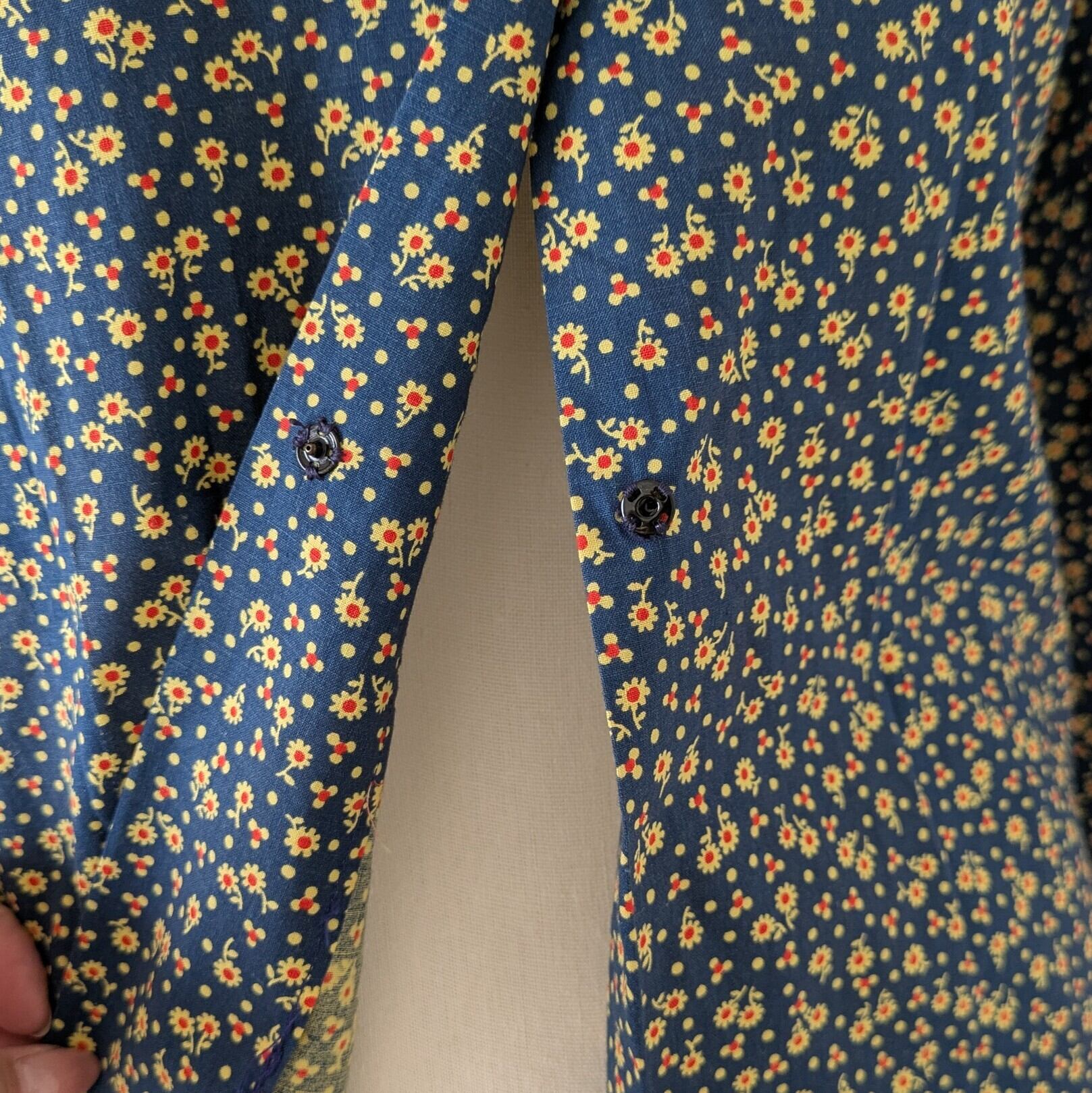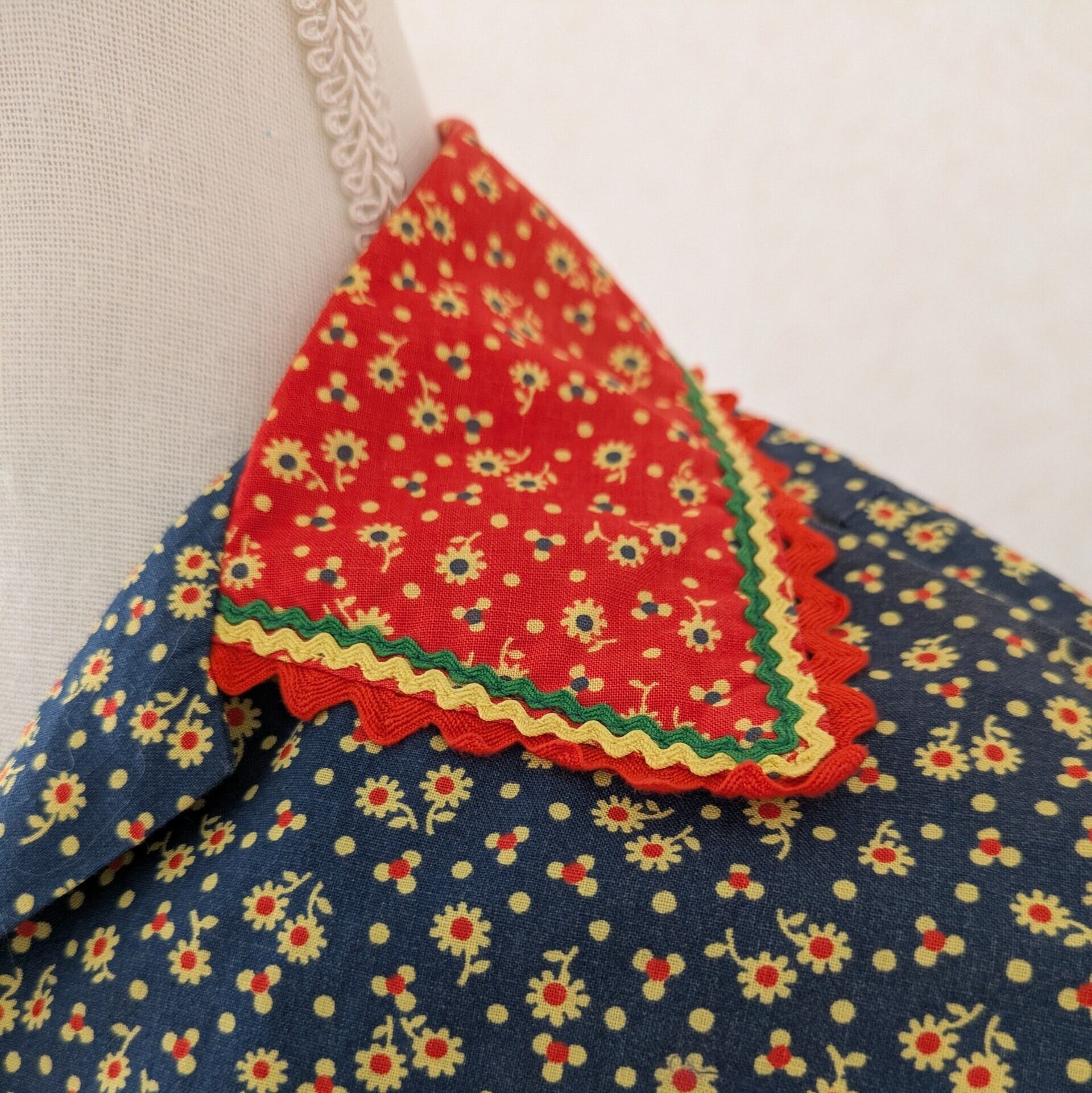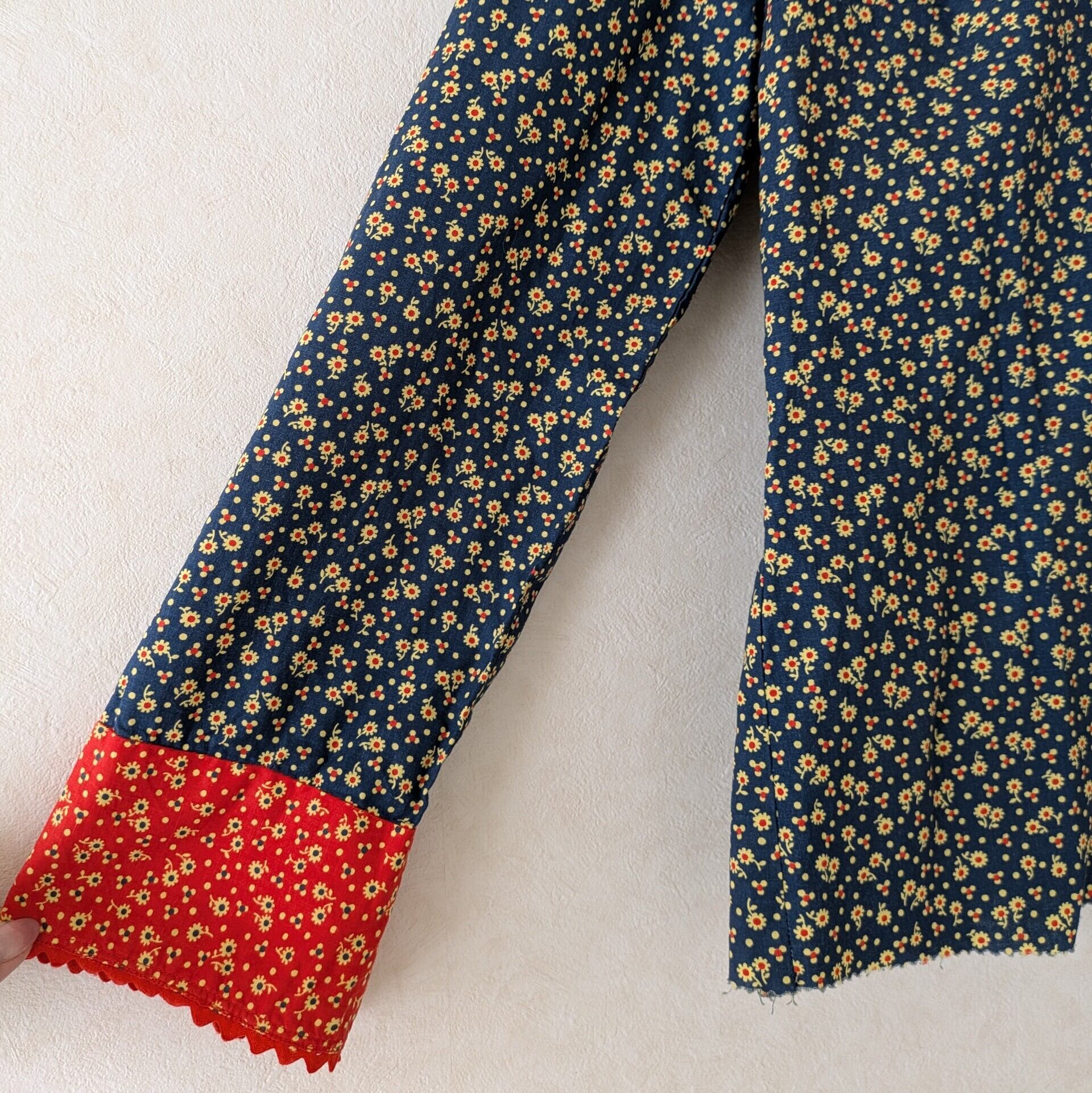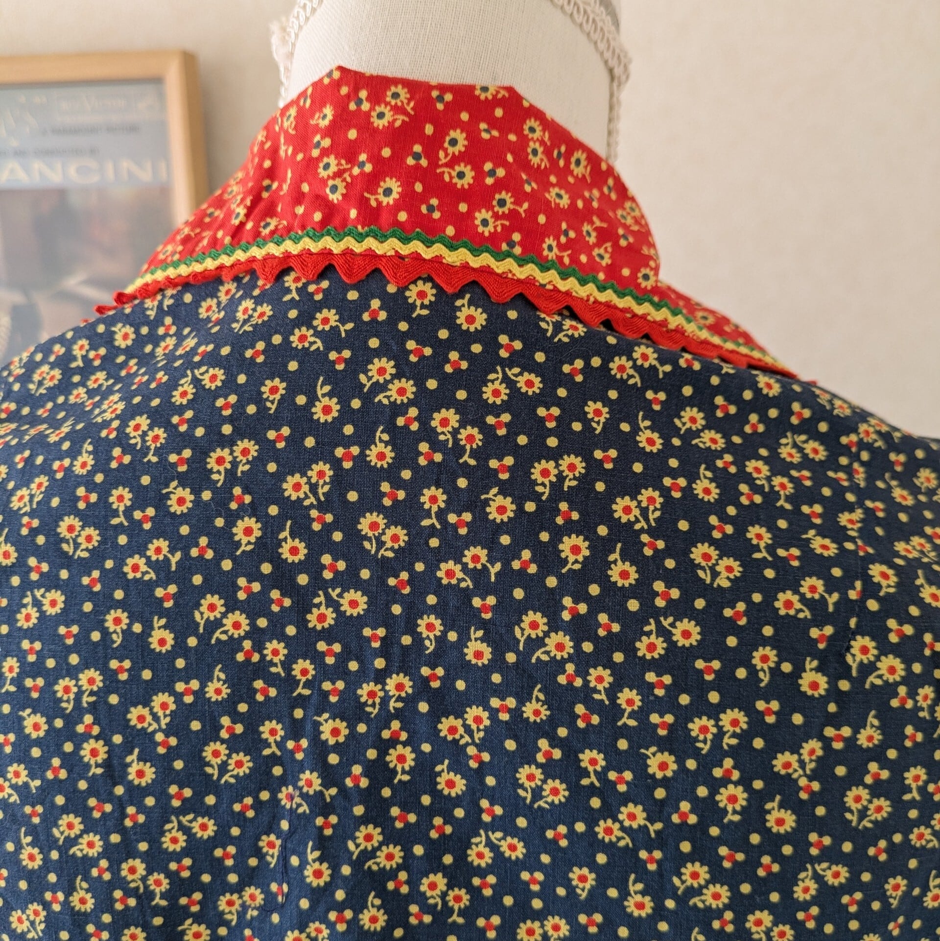 ネイビーの小花柄に襟と袖口はオレンジを配置。そしてギザギザのパイピングに裾はギザギザの切りっぱなし。