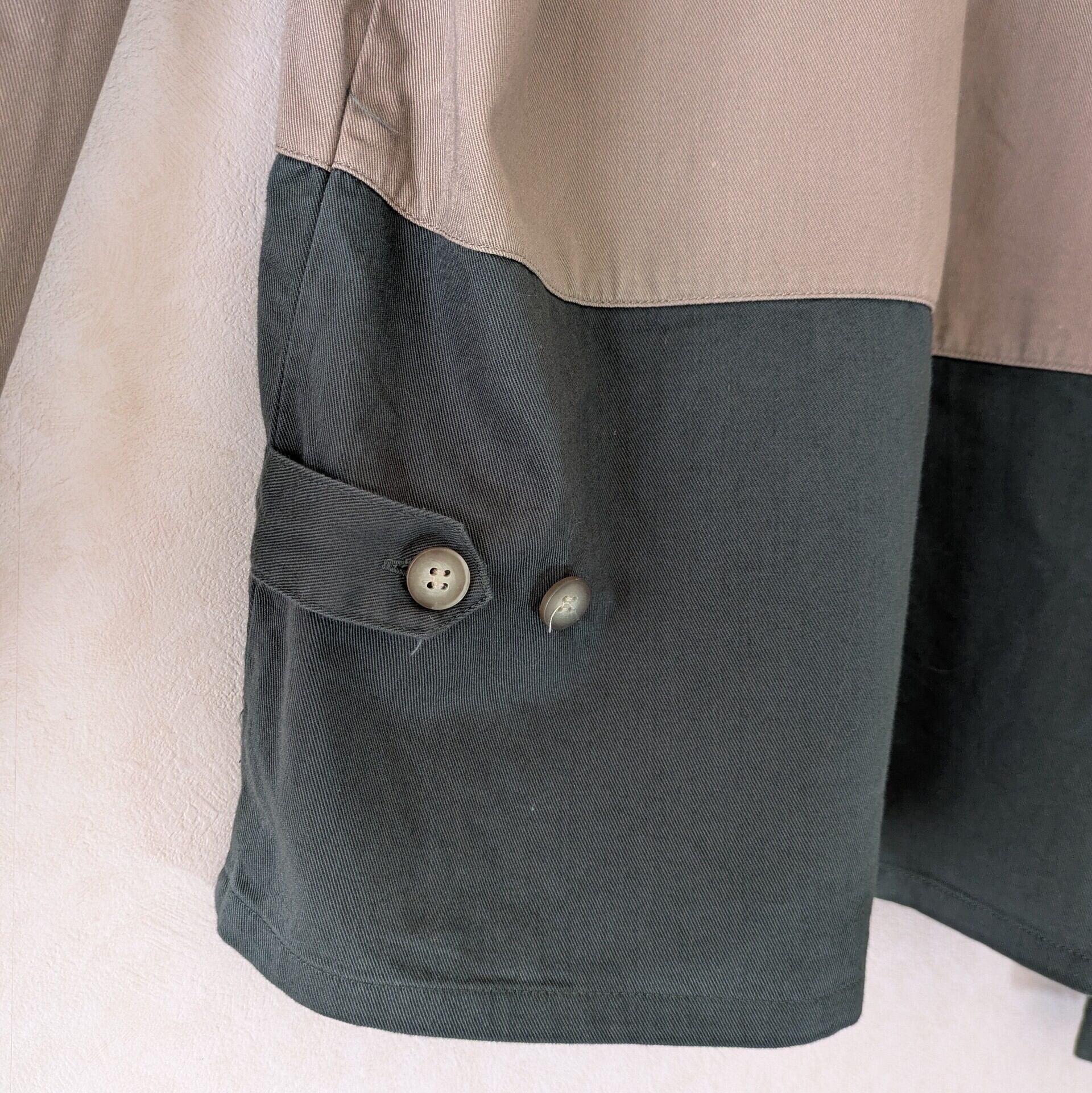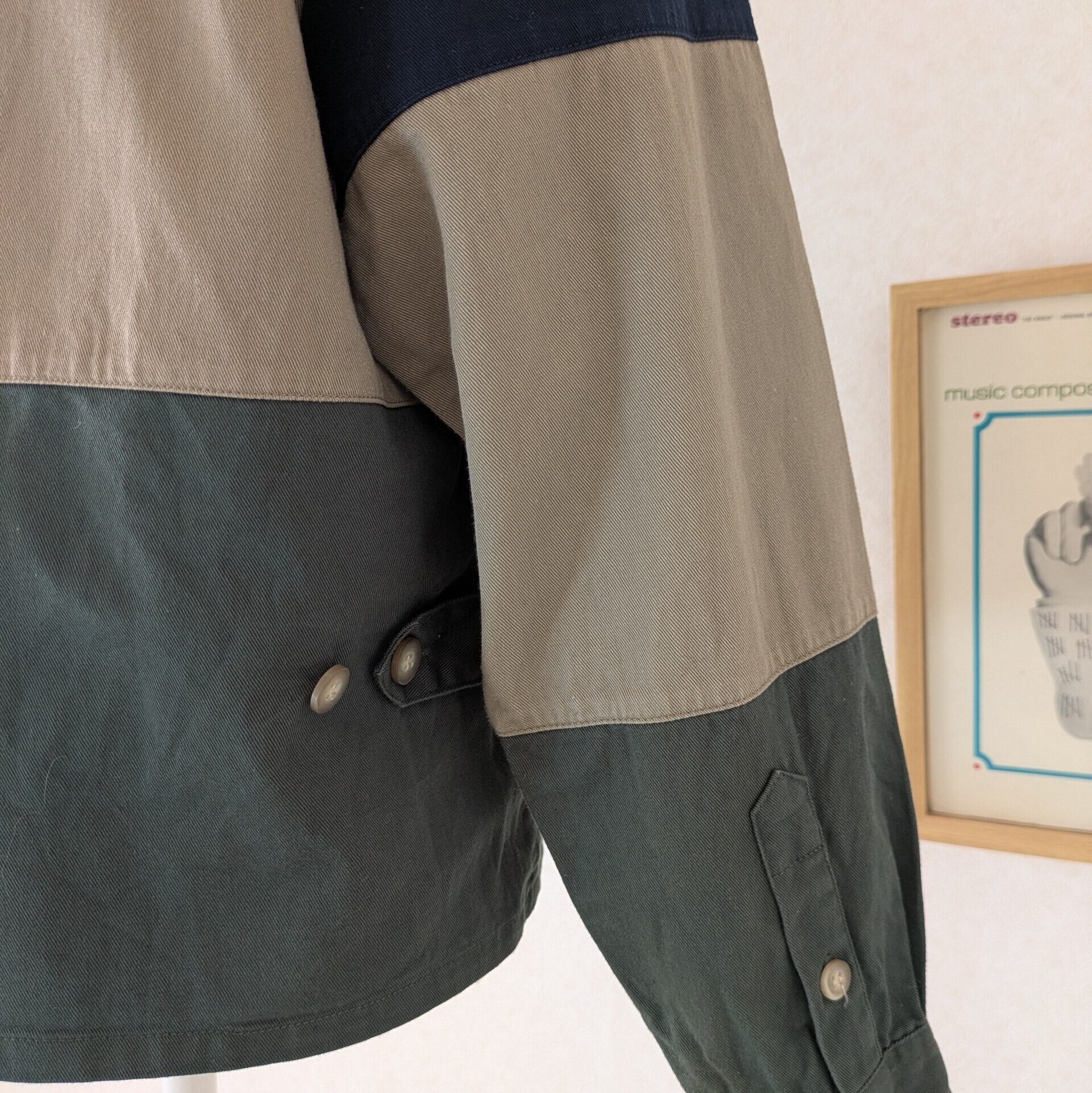 ネイビー、ベージュ、カーキの3色が使われたシャツです。